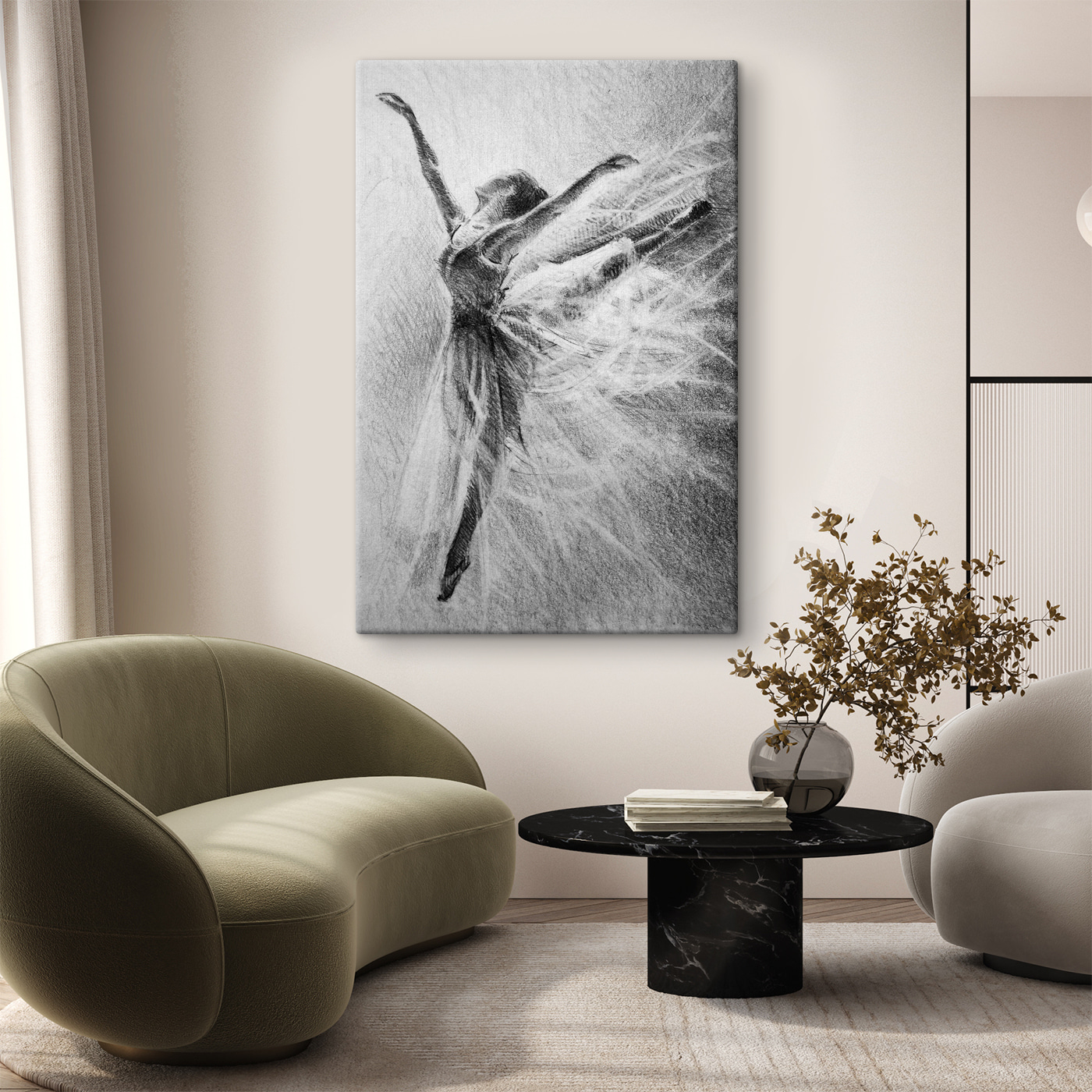 Stel je voor dat je uitrust in je woonkamer en je kijkt omhoog naar deze prachtige canvasprint – een delicate tekening van een dansende vrouw. Het is vol gratie en beweging, bijna alsof het van de muur zou kunnen springen en door de kamer zou kunnen draaien. Dit stuk is niet zomaar kunst; het is een ervaring. De schetsmatige streken en luchtige texturen lijken verhalen van elegantie en vrijheid te fluisteren. Deze print is perfect om een vleugje sereniteit toe te voegen aan elke ruimte en zou wel eens kunnen inspireren tot een danspasje of twee in je eigen woonkamer! Wat een gespreksstarter, nietwaar? Ideaal voor iedereen die de schoonheid van de menselijke vorm en het plezier van dansen koestert.