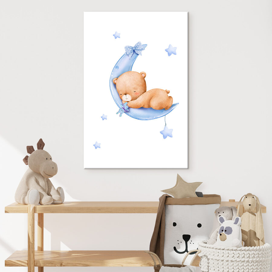 Stel je deze lieve canvasprint voor van een teddybeer die ligt te slapen op een maansikkel in de kamer van je kind. Met de titel “Teddybeer slaapt op de maan” behoort het tot een aantal leuke categorieën: Canvas Kunst voor Kinderen, Canvas Kunst met Dieren en Populaire Canvas Kunst. Het is dus behoorlijk geliefd!