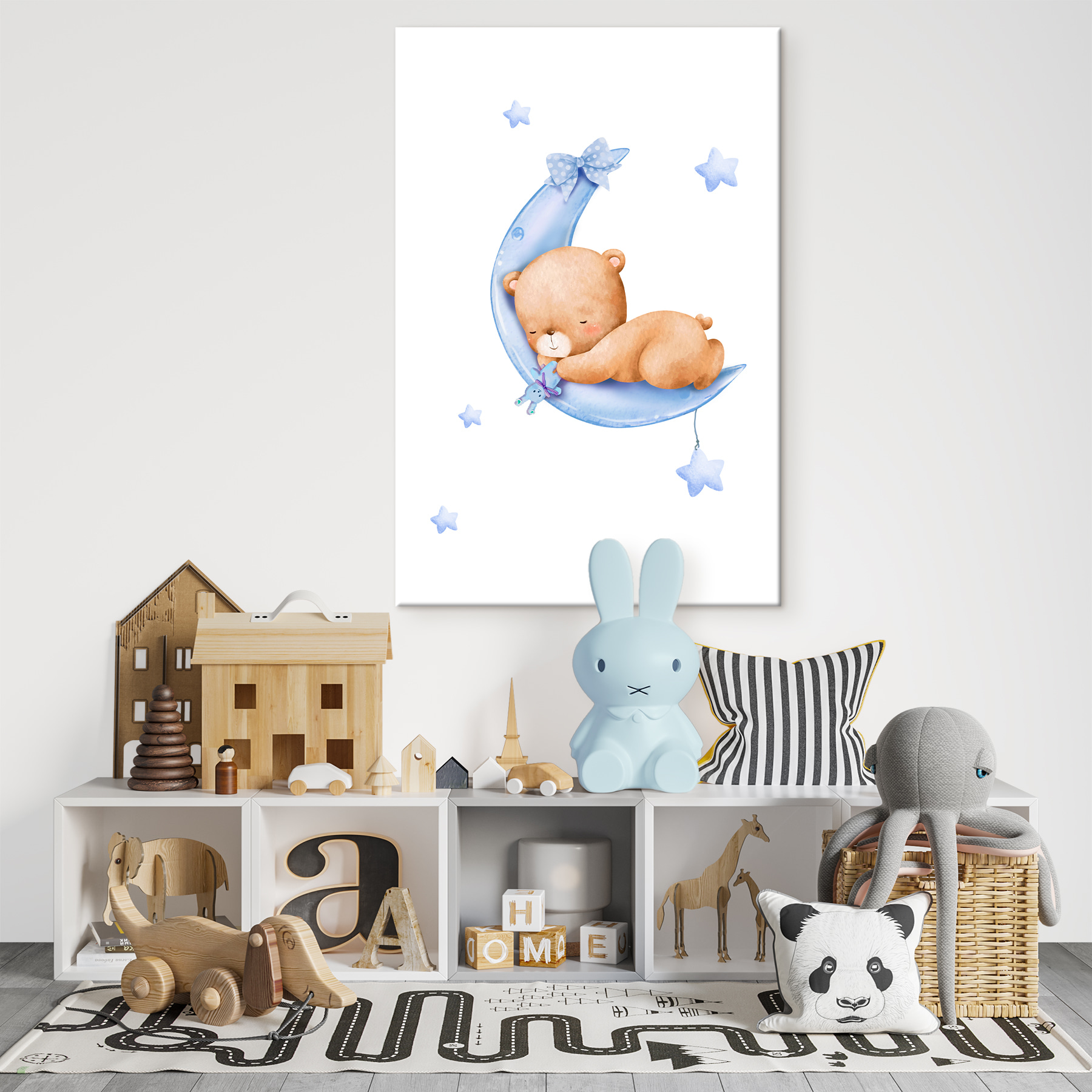 Stel je deze lieve canvasprint voor van een teddybeer die ligt te slapen op een maansikkel in de kamer van je kind. Met de titel “Teddybeer slaapt op de maan” behoort het tot een aantal leuke categorieën: Canvas Kunst voor Kinderen, Canvas Kunst met Dieren en Populaire Canvas Kunst. Het is dus behoorlijk geliefd!