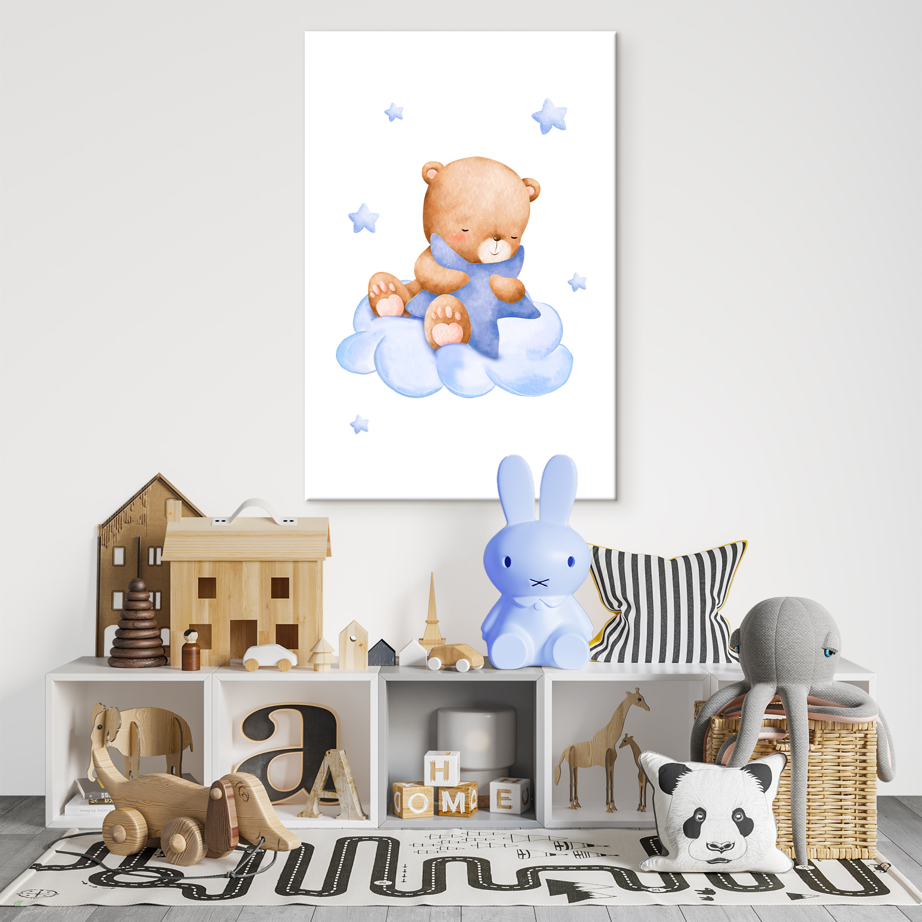 Oh, is dit niet het liefste kleine ding? Stel je voor dat dit charmante canvas in een kinderkamer hangt en allerlei grillige dromen oproept. Stel je een knuffelbeer voor, zachtjes snoozend op een zachte, pluizige wolk, gewikkeld in een knusse knuffel met een twinkelende blauwe ster.