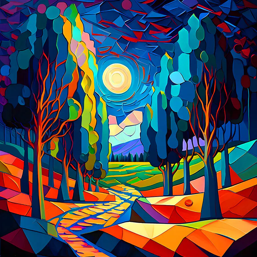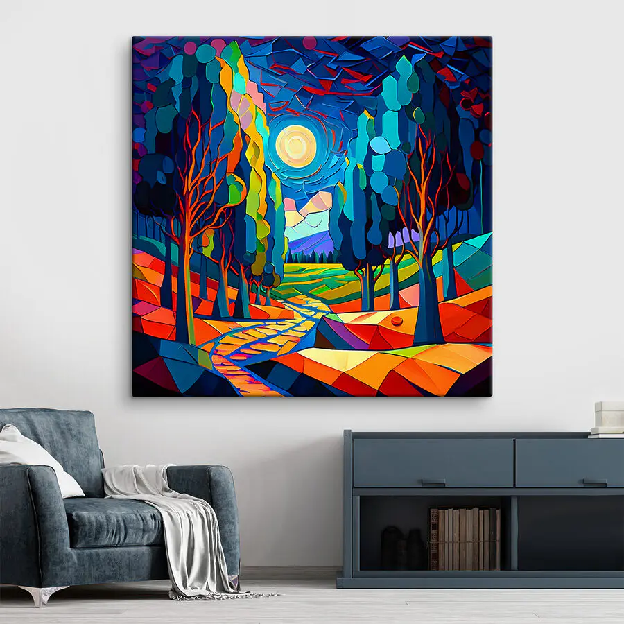 Stel je voor dat je thuiskomt met dit “Kleurrijke landschap met bomen en een pad” op je muur – het is alsof je zo een vrolijke droom binnenwandelt. De levendige kleuren en het grillige ontwerp maken het onmogelijk om niet te glimlachen. Knalblauw en glanzend groen, met een vleugje vurig oranje, schilderen een betoverend bospad. Het is alsof de bomen geheimen hebben en dat pad? Dat is jouw reis. Perfect voor een kamer die een vleugje leven of een duwtje in de richting van avontuur nodig heeft. Pro tip: het past prachtig bij een gezellige leeshoek of een levendige familiekamer. Er is gewoon iets magisch – het fluistert bijna “Kom, verdwaal in mij”.