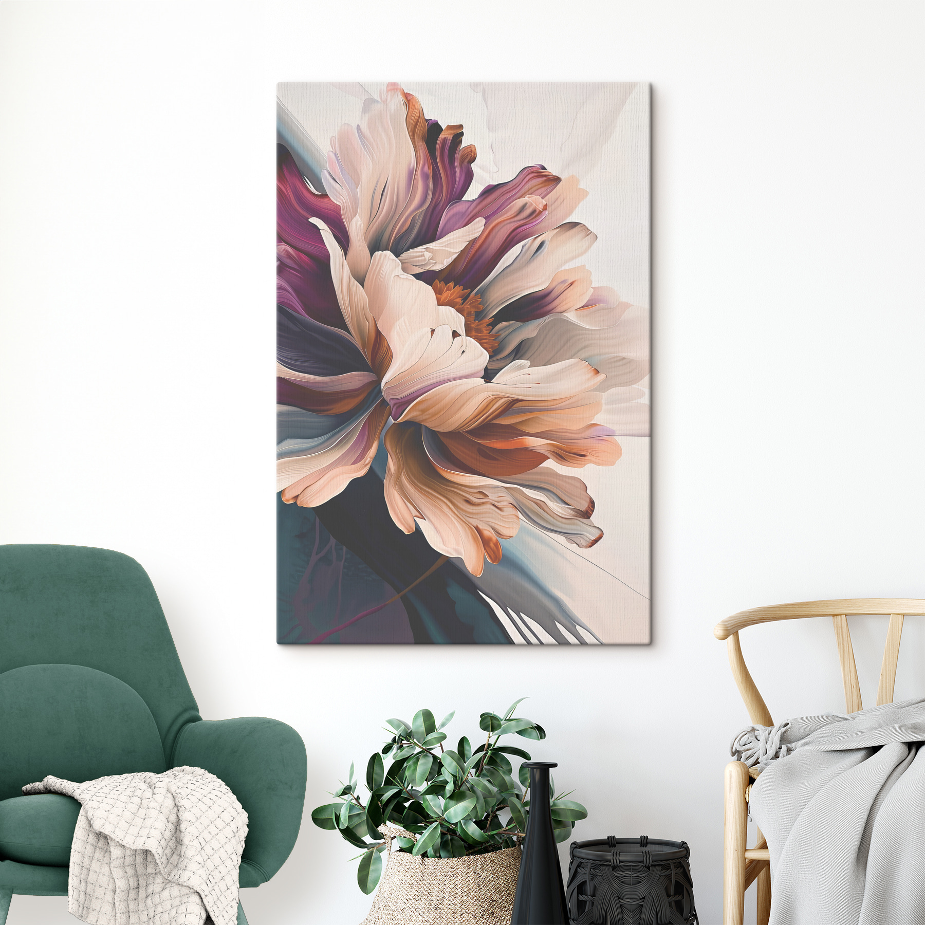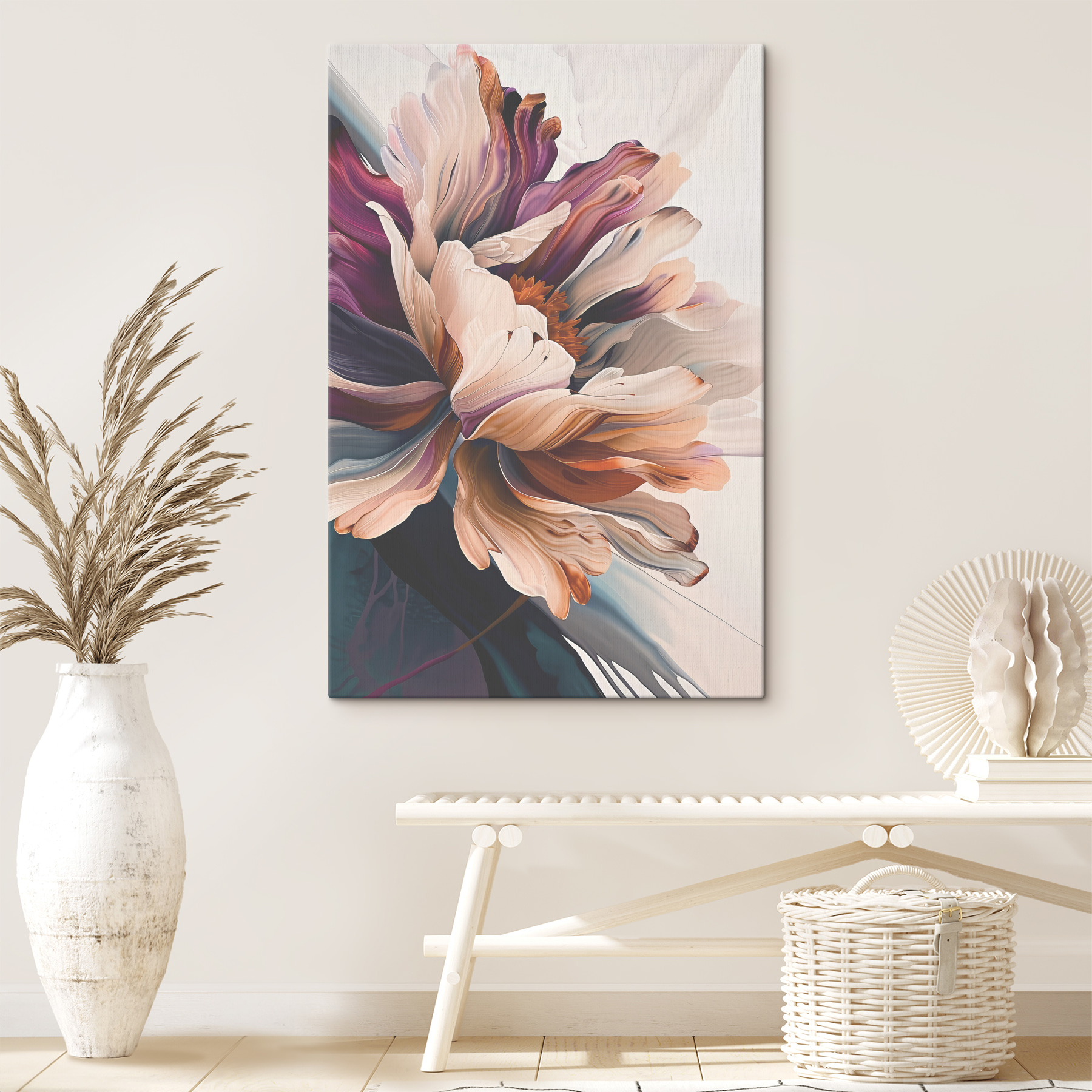 Transformeer elke kamer met deze prachtige canvasprint met een abstract bloemenpatroon dat barst van de levendige kleuren. Stel je voor dat je een ruimte binnenloopt gevuld met de warmte van zachte bloemblaadjes die je uitnodigen, als een knusse knuffel van de natuur. De zachte wervelingen van kleur creëren lagen die je naar binnen trekken, perfect om gesprekken op gang te brengen of gewoon om te genieten van een rustig moment. Het is het soort kunst dat net zo goed tot zijn recht komt in een woonkamer als in een keuken. Haal het buitenleven naar binnen en laat je muren opbloeien met persoonlijkheid. Perfect voor bloemenliefhebbers of iedereen die een vleugje vreugde aan zijn interieur wil toevoegen.