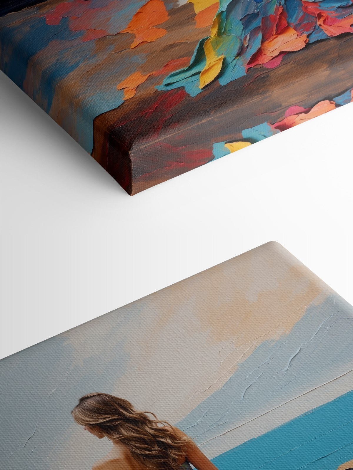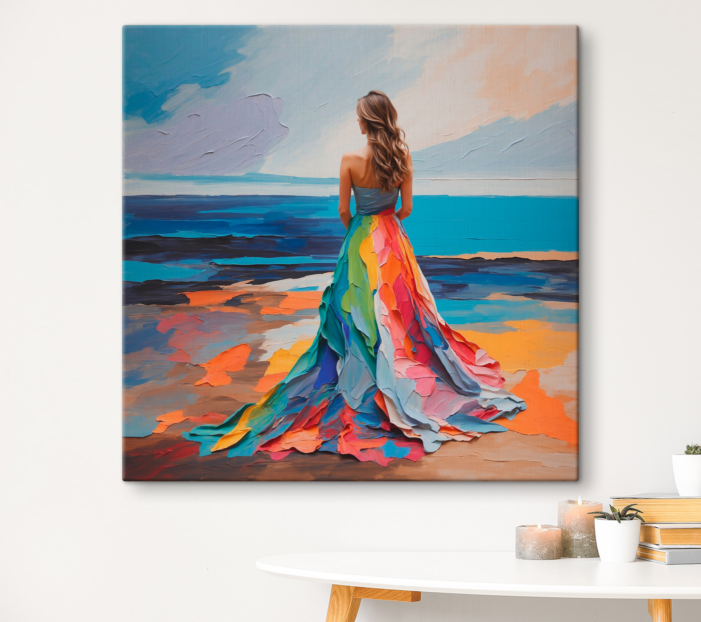 Deze prachtige canvasprint, met een vrouw in een levendige jurk, brengt een vleugje kleur en een oceaanbriesje in elke kamer. Stel je voor dat je langsloopt en een glimp opvangt van haar dromerige pose, alsof ze in gedachten verzonken is en naar de eindeloze zee staart. Het is alsof ze je uitnodigt om een beetje te dagdromen. Perfect voor een leefruimte die een vleugje persoonlijkheid nodig heeft of een rustig hoekje om tot rust te komen. De levendige tinten zorgen moeiteloos voor vrolijkheid, waardoor je alle drukte buiten even vergeet. Hang deze schoonheid op en laat het verhalen van reislust en serene ontsnappingen in je huis weven.