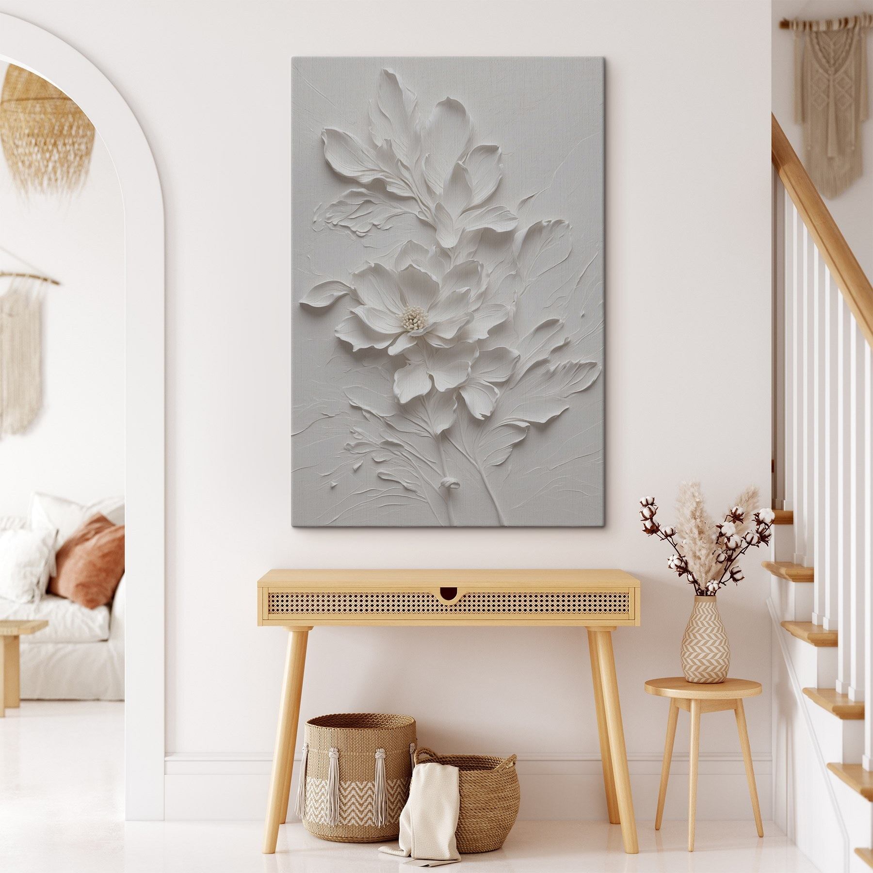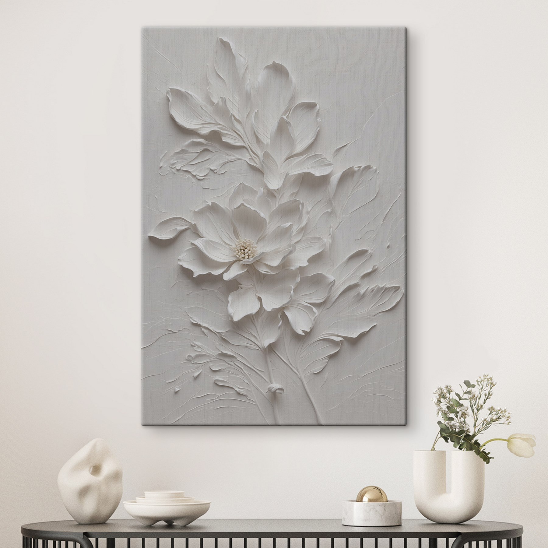 Deze canvasprint, getiteld “Delicate White Floral Design Artwork”, is een prachtige aanwinst voor elke ruimte. Stel het je eens voor in je woonkamer – die zachte, ingewikkelde bloemen lijken bijna van het doek af te bloeien! Het heeft een serene, elegante uitstraling waardoor de hele kamer op de een of andere manier vrediger aanvoelt. Perfect voor als je een moment van zen wilt. Het is geweldig voor natuurliefhebbers en iedereen die van mooie kunst houdt. Je zult merken dat je er gewoon naar staart en je afvraagt hoe zoiets simpels zo fascinerend kan zijn. Of je nu een doorgewinterde kunstverzamelaar bent of gewoon iemand die van schoonheid houdt, dit kunstwerk heeft de gave om elke dag een beetje mooier te maken. Bovendien is het veelzijdig – het past in elke interieurstijl zonder de aandacht te stelen, net als de zelfverzekerde beste vriend die we allemaal nodig hebben.