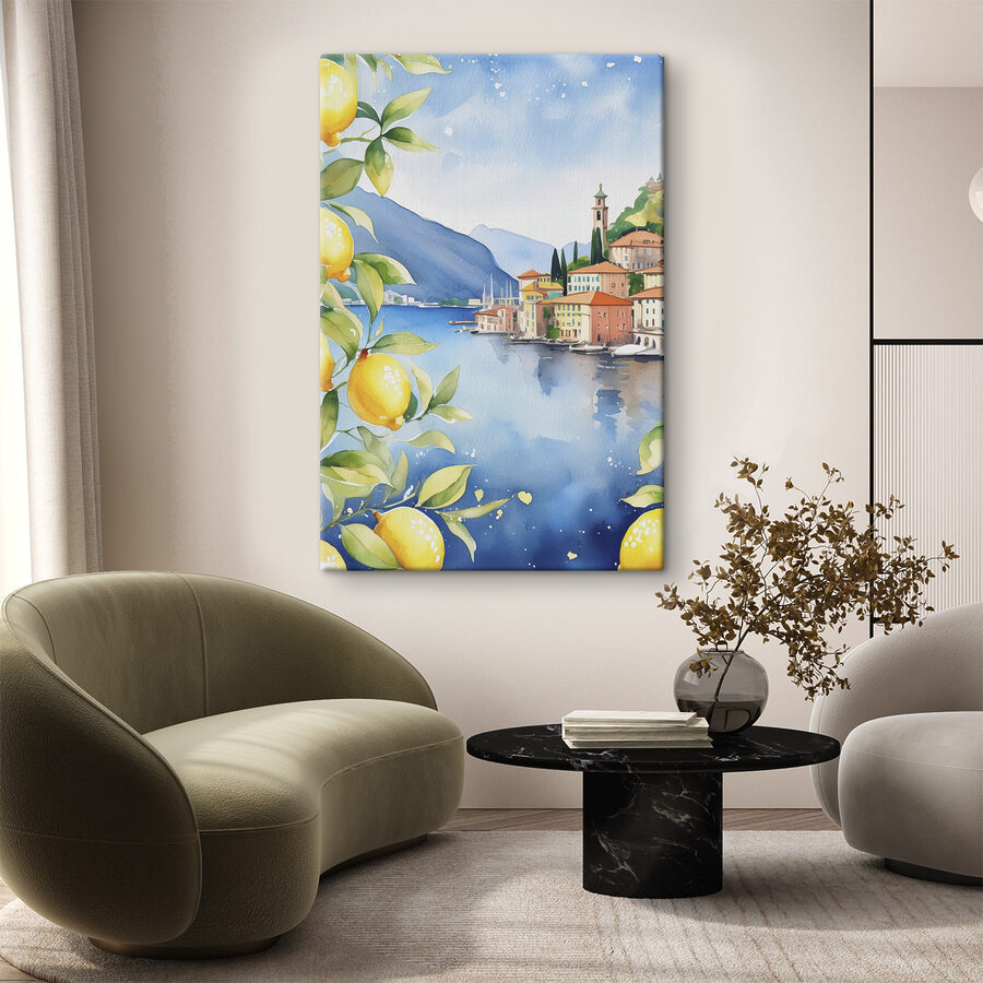 Stel je een zonnige middag bij een rustig meer voor, met de zoete geur van verse citroenen in de lucht. Deze canvasprint “Lemon Grove by the Lake” geeft die dromerige sfeer perfect weer. Met de zachte aquarellen en het charmante dorpje aan het meer brengt het een vleugje warmte en vrolijkheid in elke kamer. Zie het al voor je in een gezellige keuken of een lichte woonkamer, waar het vreugde en gespreksstof opwekt. Bovendien is het net een kleine ontsnapping telkens als er iemand voorbij loopt. Wie zou er niet willen wegglijden in die serene, citroenachtige sfeer? Eén blik en het is een en al zonneschijn en glimlach.