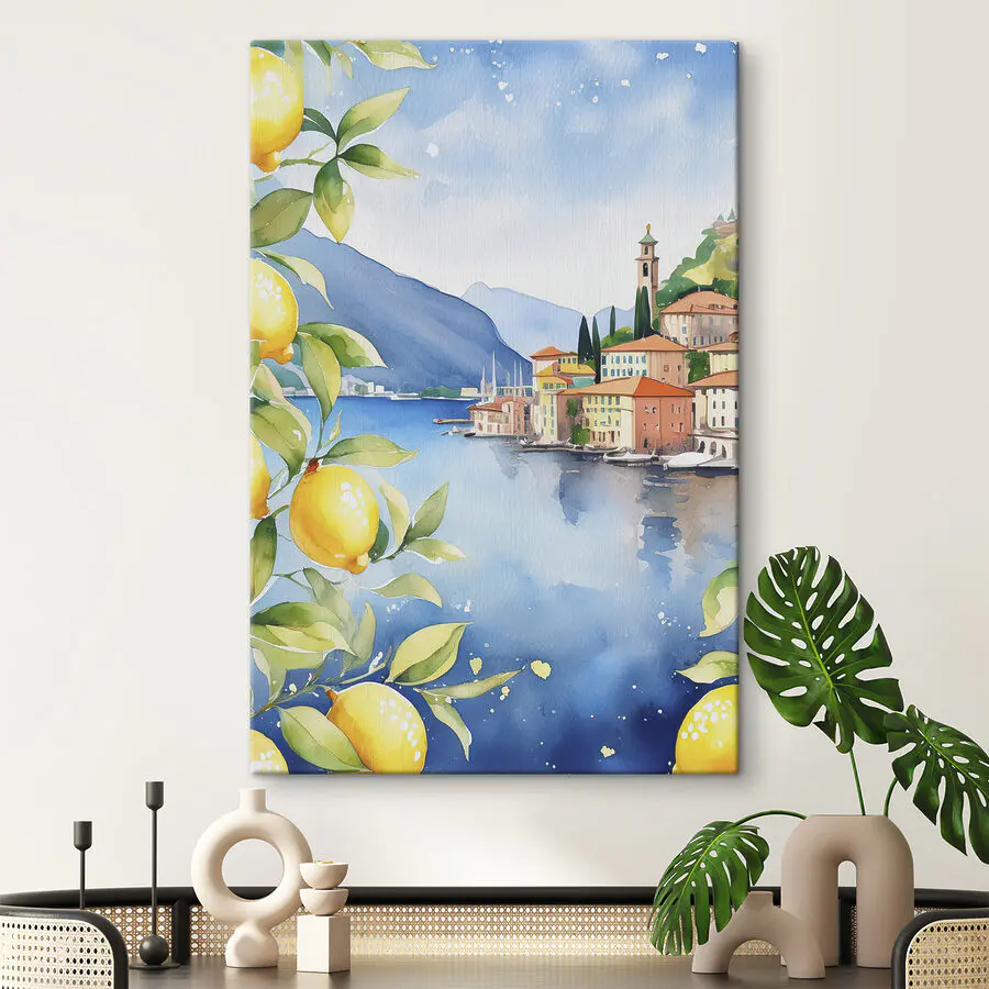 Stel je een zonnige middag bij een rustig meer voor, met de zoete geur van verse citroenen in de lucht. Deze canvasprint “Lemon Grove by the Lake” geeft die dromerige sfeer perfect weer. Met de zachte aquarellen en het charmante dorpje aan het meer brengt het een vleugje warmte en vrolijkheid in elke kamer. Zie het al voor je in een gezellige keuken of een lichte woonkamer, waar het vreugde en gespreksstof opwekt. Bovendien is het net een kleine ontsnapping telkens als er iemand voorbij loopt. Wie zou er niet willen wegglijden in die serene, citroenachtige sfeer? Eén blik en het is een en al zonneschijn en glimlach.