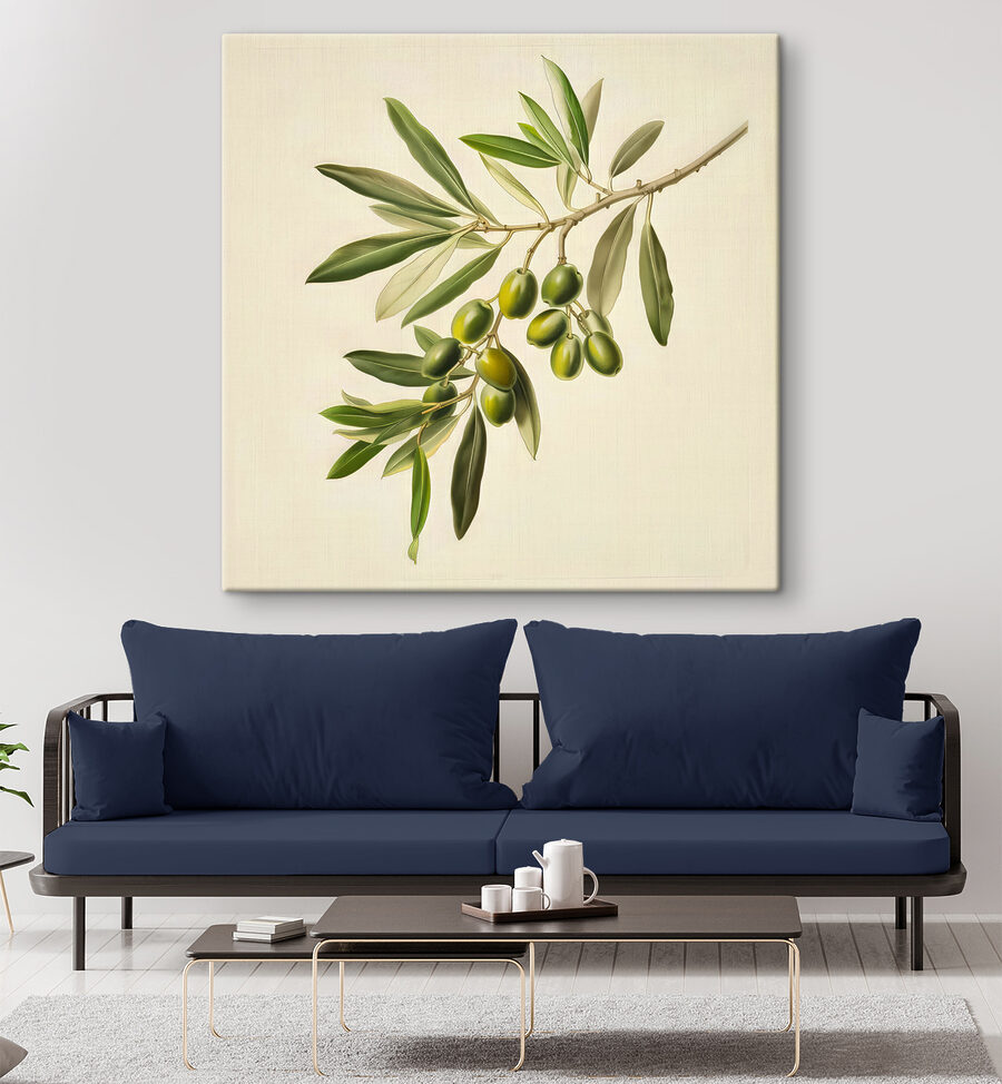 Haal een stukje natuur in huis met deze prachtige canvasprint van een olijftak, compleet met weelderig groene olijven die er gewoon bijhangen. Het is alsof je een rustig hoekje van de Middellandse Zee in huis hebt. Het diepe groen en de zachte rondingen van de bladeren nodigen uit tot dagdromen over verse olijfolieproeverijen en een warm briesje. Stel je deze schoonheid voor boven je eettafel of in een gezellig leeshoekje. Perfect om een vleugje leven toe te voegen aan elke ruimte, het is een gespreksstarter zonder het te proberen. Je muren zullen je dankbaar zijn en je gasten ook!