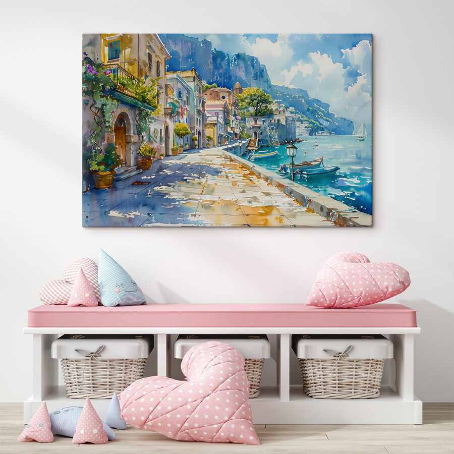 Fleur elke muur op met deze charmante canvasprint van een dorpje aan zee, waar kleurrijke boten zachtjes dobberen in het zonovergoten water. Stel je voor dat je deze serene scène binnenstapt, de zachte bries op je gezicht voelt en in de verte het gelach hoort van mensen die van de dag genieten. Perfect voor een gezellige woonkamer of een vrolijke entree, het fluistert verhalen van strandwandelingen en zonovergoten middagen. De speelse aquarelwas brengt een vleugje eigenzinnigheid en verandert elke ruimte in een heerlijk uitje. Eén blik en je wordt meegevoerd – wie heeft een vakantie nodig als je muur een venster naar het paradijs kan zijn?