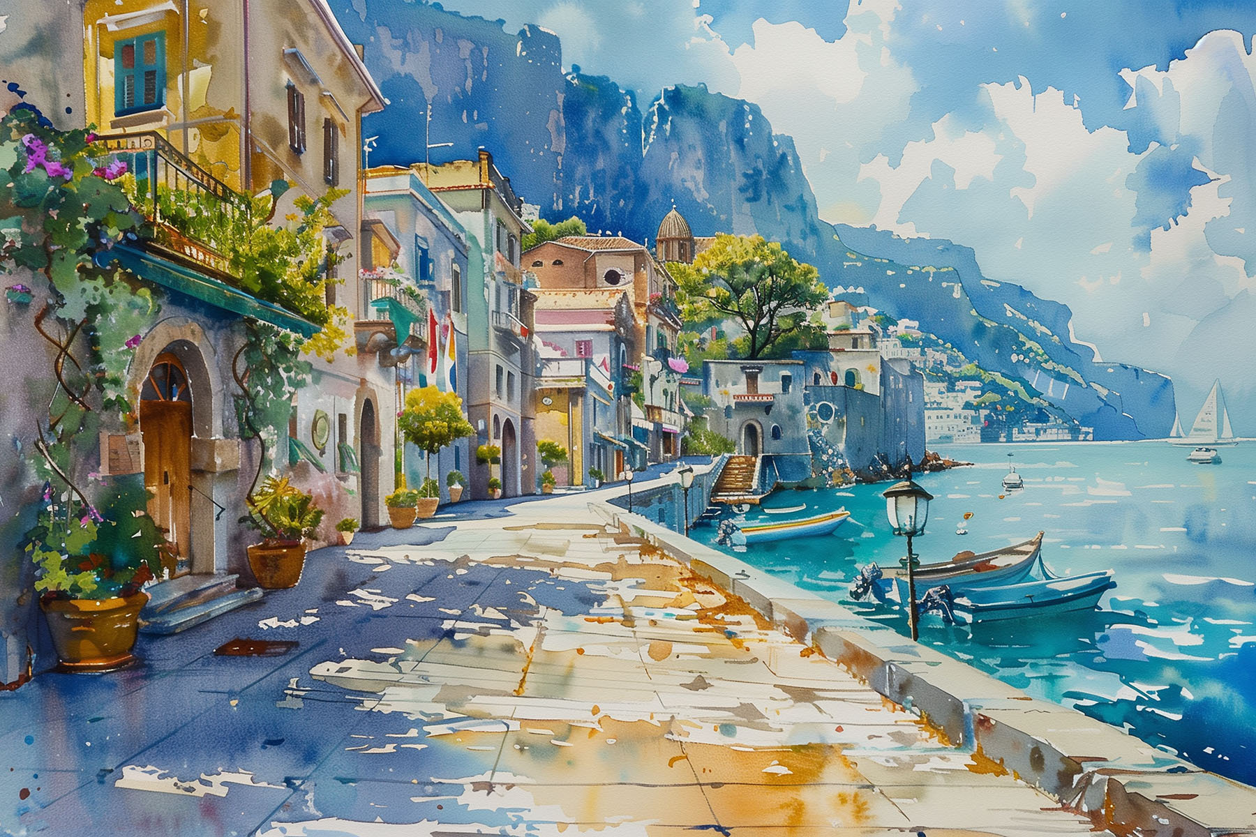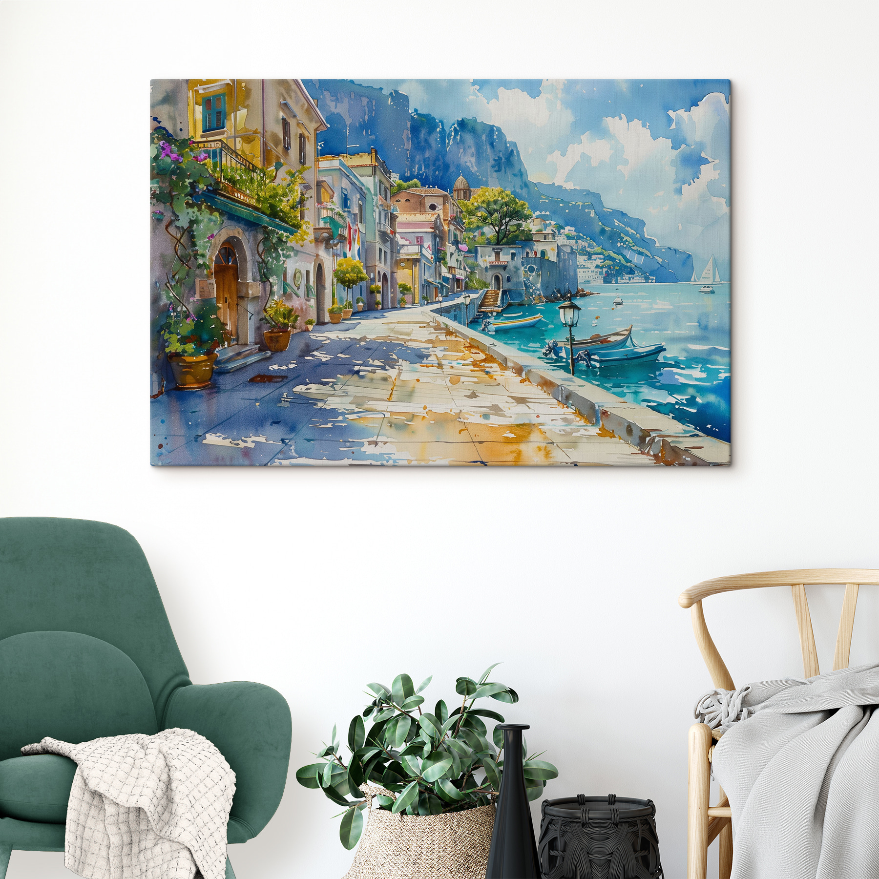 Fleur elke muur op met deze charmante canvasprint van een dorpje aan zee, waar kleurrijke boten zachtjes dobberen in het zonovergoten water. Stel je voor dat je deze serene scène binnenstapt, de zachte bries op je gezicht voelt en in de verte het gelach hoort van mensen die van de dag genieten. Perfect voor een gezellige woonkamer of een vrolijke entree, het fluistert verhalen van strandwandelingen en zonovergoten middagen. De speelse aquarelwas brengt een vleugje eigenzinnigheid en verandert elke ruimte in een heerlijk uitje. Eén blik en je wordt meegevoerd – wie heeft een vakantie nodig als je muur een venster naar het paradijs kan zijn?