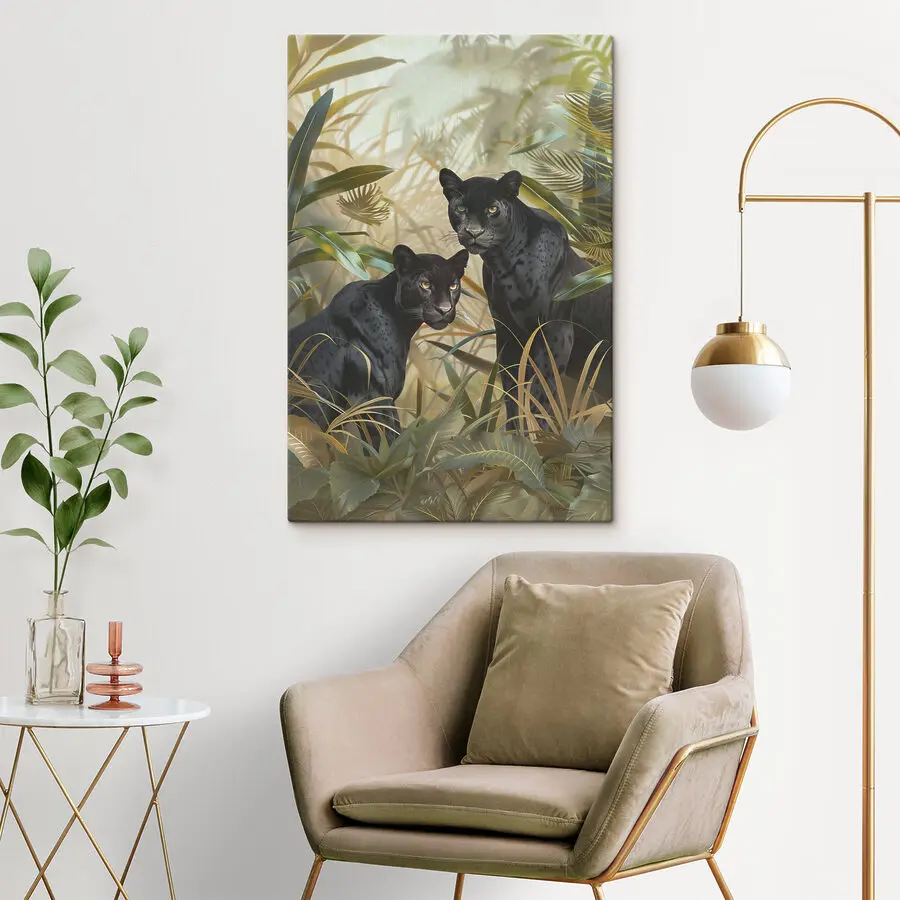 Ooit gedroomd van een stukje wildernis in je woonkamer? Deze “Black Panther with Yellow Eyes” canvasprint is je ticket naar de jungle. Twee prachtige zwarte panters, gevangen met die doordringende gele ogen, hebben bijna het gevoel dat ze je kamer bewaken. Ze gaan naadloos op in het weelderige groen en voegen een vleugje mysterie en durf ik te zeggen… een beetje avontuur toe aan je muren.