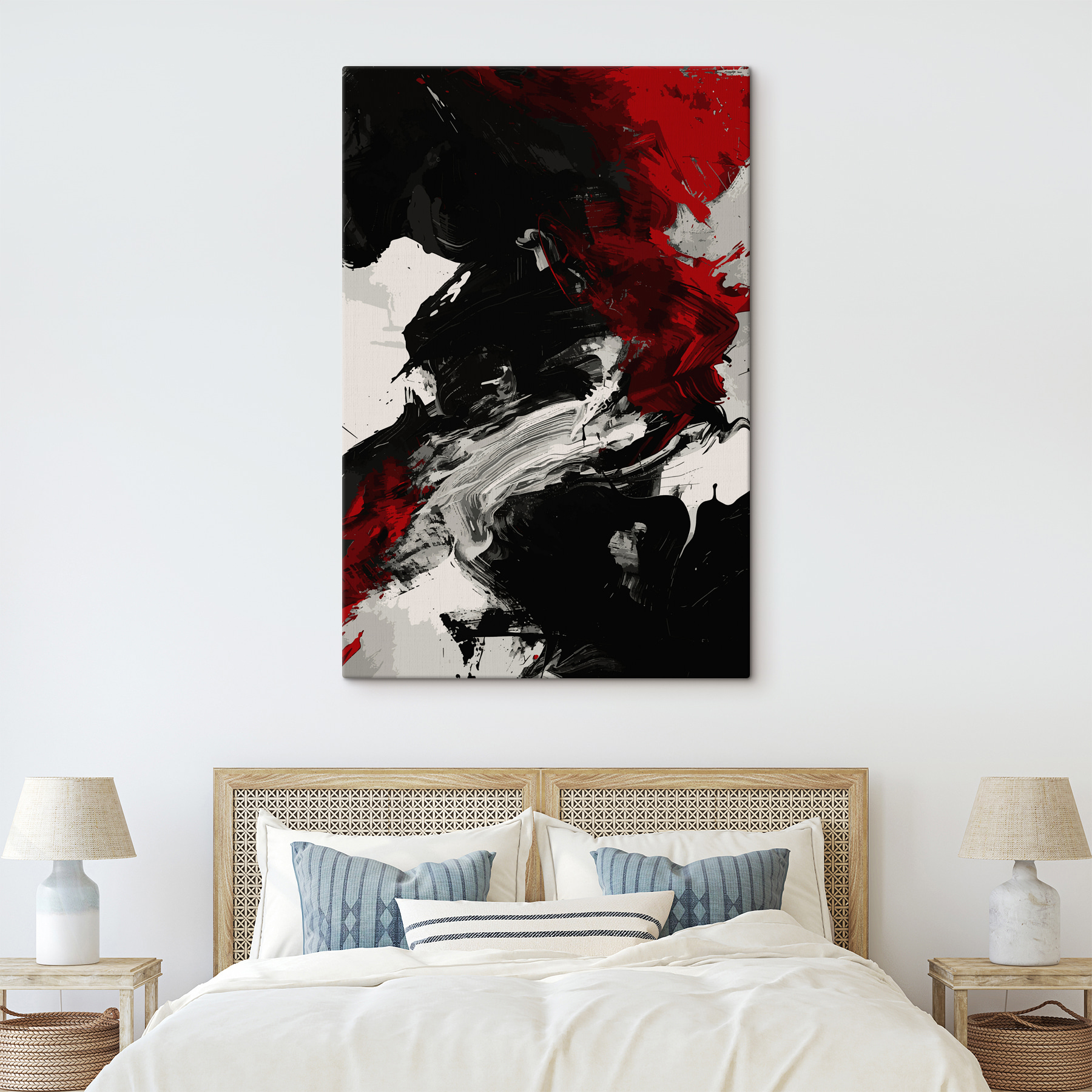 Duik in een wereld van stemmige contrasten met deze canvasprint, waar dieproden en gewaagde zwarten samen dansen in een dramatische omhelzing. Het is als een gepassioneerd gesprek tussen kleuren – elke beweging vertelt een verhaal dat je naar binnen trekt. Stel je voor dat je het in een gezellig hoekje of een strakke kantoorruimte hangt. Het zal zeker de aandacht trekken en misschien zelfs een paar complimenten opleveren. De levendige tinten kunnen je koffie ‘s ochtends energie geven of een vleugje intrige toevoegen tijdens avondbijeenkomsten. Perfect voor wie houdt van kunst met een beetje pit, waardoor elke muur een gespreksstarter wordt.