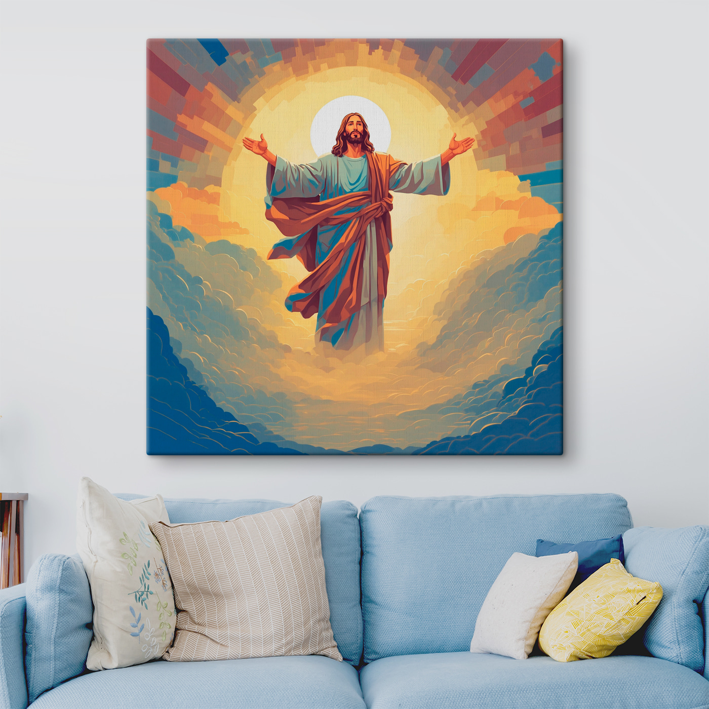 Breng een vleugje van het buitengewone in je interieur met deze fascinerende canvasprint. Stel je de warmte voor van een figuur met wapperend haar en een serene uitdrukking, de armen wijd open alsof ze de wereld omhelst. Het is alsof je een lieve, vriendelijke vriend in huis haalt. De stralende kleuren dansen in het rond en creëren een gevoel van hoop en rust. Perfect voor een gezellig hoekje of een grote muur. Stel je het voor boven een bedachtzaam leeshoekje of in een levendige hal, waar het iedereen eraan herinnert om even stil te staan, adem te halen en de kleine momenten in het leven te waarderen. En laten we eerlijk zijn: iedereen houdt van een gespreksstarter, toch?