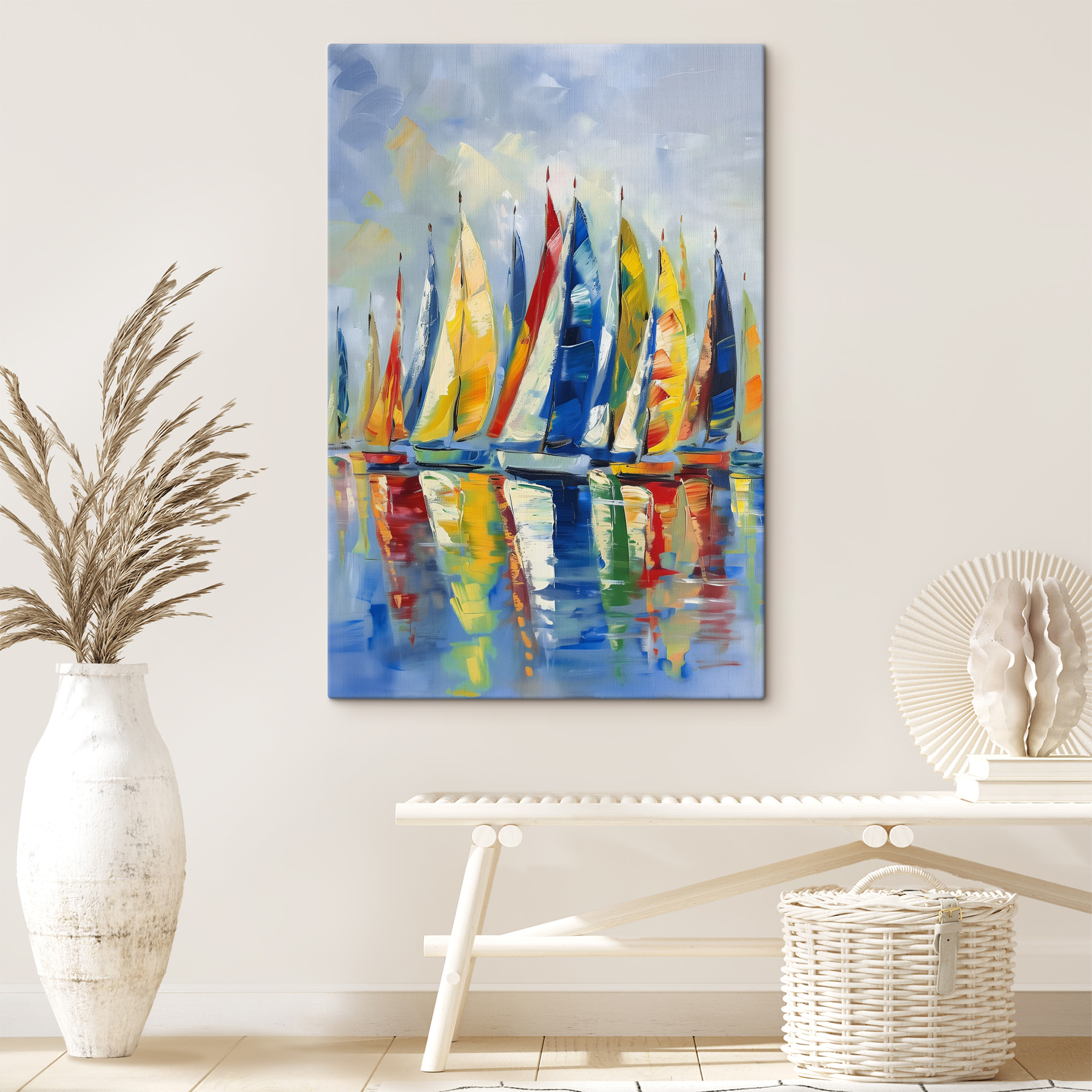 Heb je altijd al een vleugje zee in je woonruimte willen hebben? Bekijk dan deze canvasprint met de titel “Kleurrijke zeilen op een kalme zee”. Stel je dit eens voor: een vloot levendige zeilen, als een stel vrolijke vlaggetjes, glijdend over het gladde, glazige wateroppervlak. Het gaat om het vastleggen van die dromerige, zorgeloze sfeer die je aan zee krijgt. Stel het voor boven je bank of in je thuiskantoor – het zou een vleugje kleur en een heleboel charme brengen. Elke keer dat je een blik in zijn richting werpt, voel je de koele zeebries en hoor je de golven zachtjes kabbelen. Misschien is het je dagelijkse dosis zen – zonder dat je je huis uit hoeft. Perfect voor iedereen die houdt van een frisse en opbeurende toets in hun inrichting.
