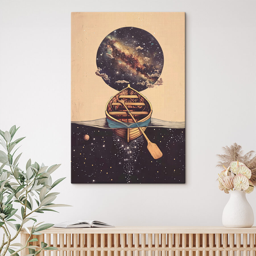 “Tekening van een boot met een peddel” – een fascinerende mix van aardse charme en kosmische magie. Dit doek fluistert verhalen van dromerige nachten op het water, met een vleugje sterrenstof. Stel je dit eens voor – een gezellige boot dobberend op een gespikkelde zee, onder een wervelend sterrenstelsel. Geweldig voor elke kamer die een vleugje verwondering nodig heeft. Stel je die lege muur eens voor – sereen en toch buitenaards. Het is een zachte herinnering aan avontuur zonder je huis te verlaten. Perfect om gesprekken op gang te brengen of gewoon om te dagdromen. Duik in het onbekende, gewoon vanaf je bank!
