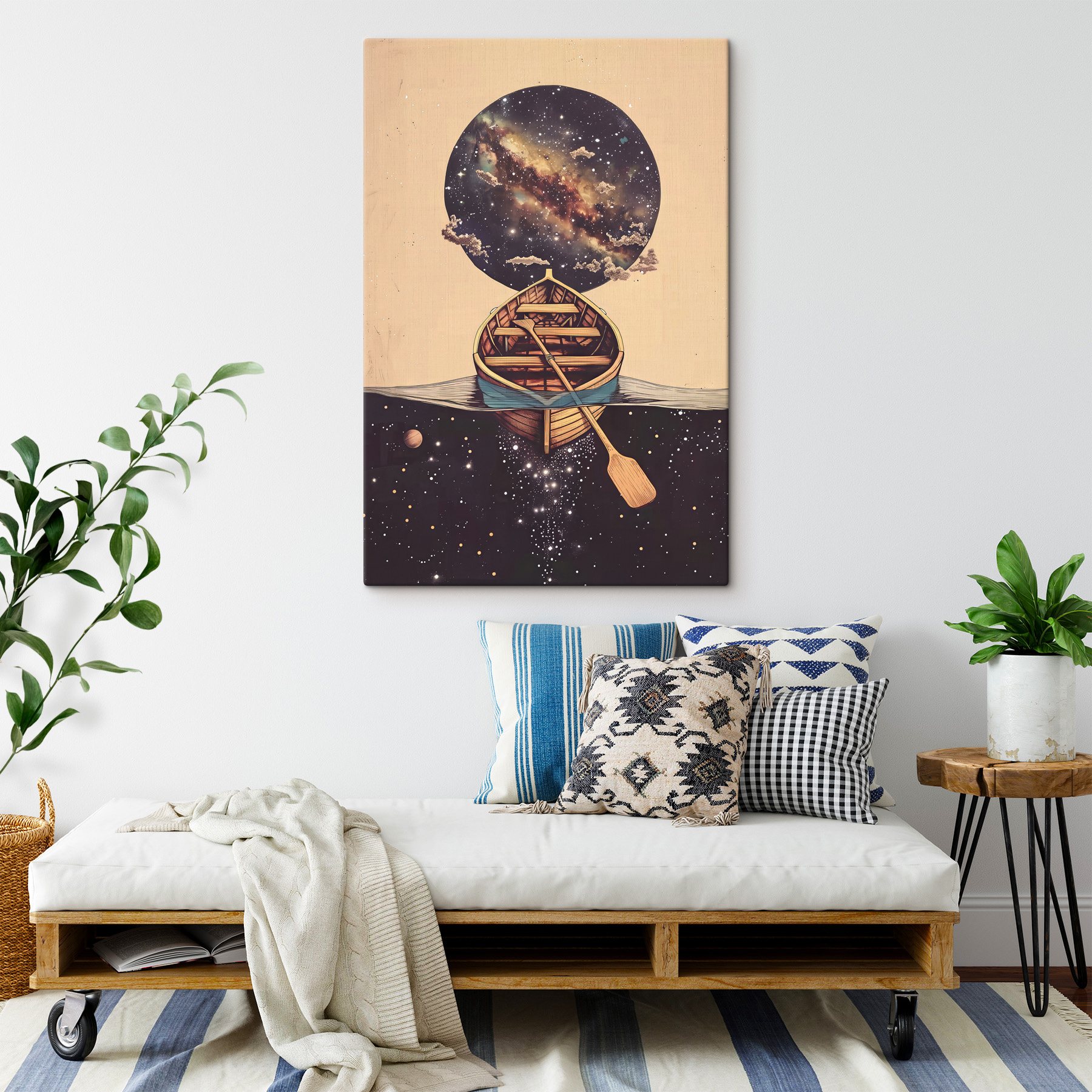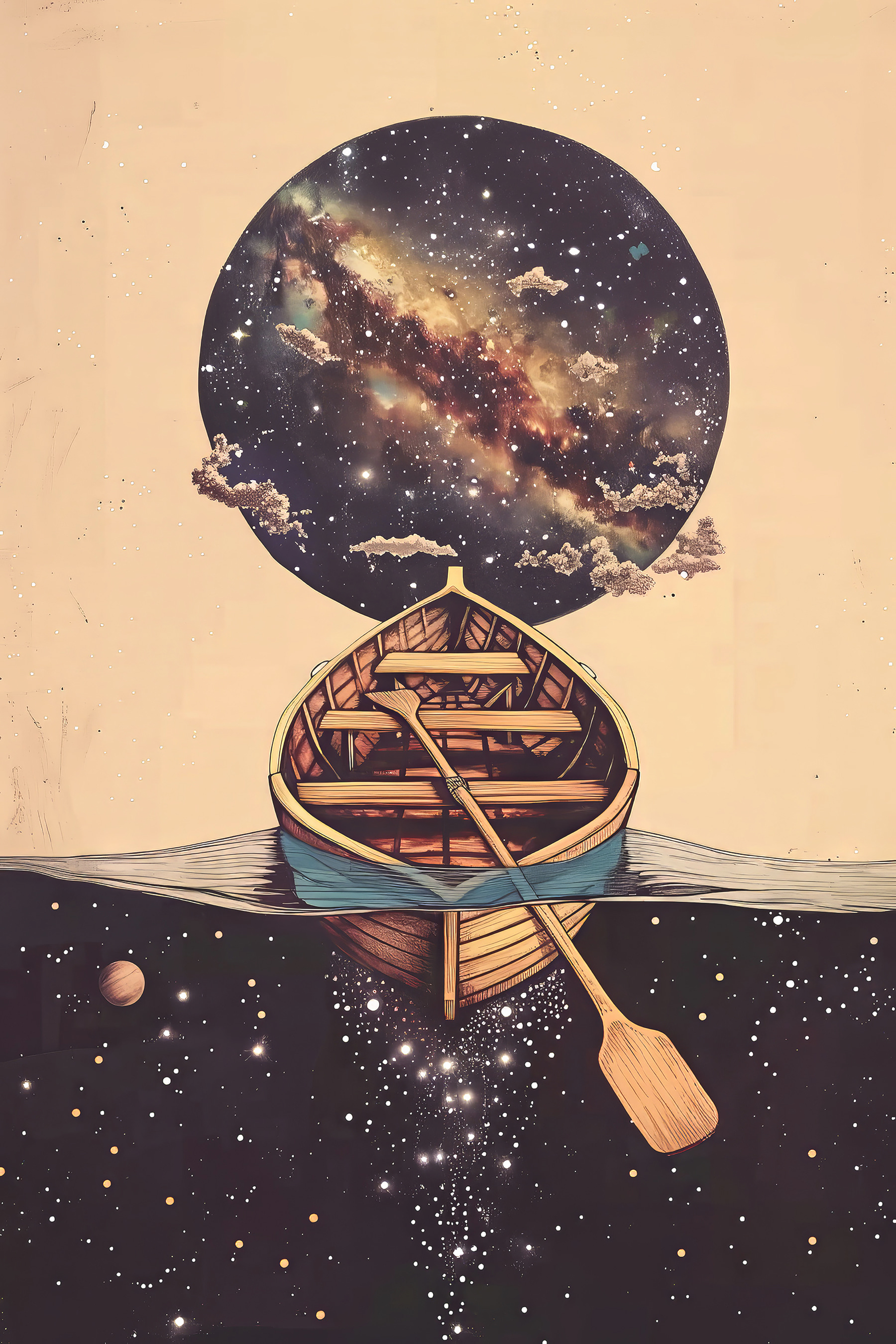 “Tekening van een boot met een peddel” – een fascinerende mix van aardse charme en kosmische magie. Dit doek fluistert verhalen van dromerige nachten op het water, met een vleugje sterrenstof. Stel je dit eens voor – een gezellige boot dobberend op een gespikkelde zee, onder een wervelend sterrenstelsel. Geweldig voor elke kamer die een vleugje verwondering nodig heeft. Stel je die lege muur eens voor – sereen en toch buitenaards. Het is een zachte herinnering aan avontuur zonder je huis te verlaten. Perfect om gesprekken op gang te brengen of gewoon om te dagdromen. Duik in het onbekende, gewoon vanaf je bank!
