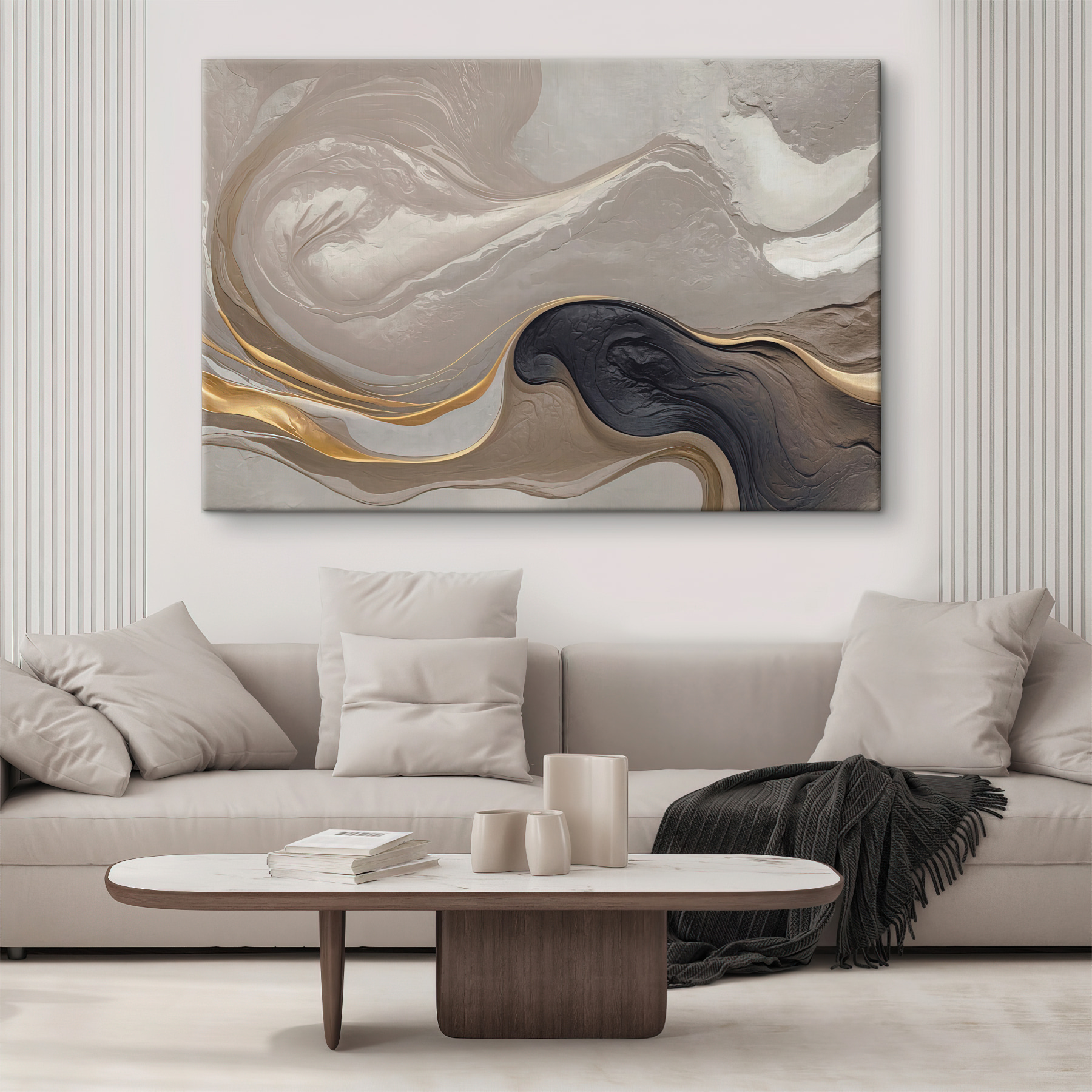 Breng een vleugje elegantie in je interieur met deze prachtige canvasprint, “Wervelend marmer met elegante lijnen”. De zachte, vloeiende patronen zijn een lust voor het oog en zouden wel eens tot dagdromen kunnen aanzetten. Stel je voor dat het je woonkamer of thuiskantoor siert en moeiteloos bij elke inrichting past. Vrienden zullen naar je toe leunen om het ontwerp te bewonderen en wie weet inspireert het tot een gesprek over abstracte kunst. De subtiele tinten kunnen een kamer in een gezellige sfeer hullen, waardoor het een perfecte achtergrond is voor lange gesprekken bij de koffie. Het is niet zomaar een kunstwerk; het is een sfeermaker, een gespreksstarter en een herinnering dat schoonheid vaak ligt in beweging en stroming. Perfect voor iedereen die op zoek is naar een betere omgeving!