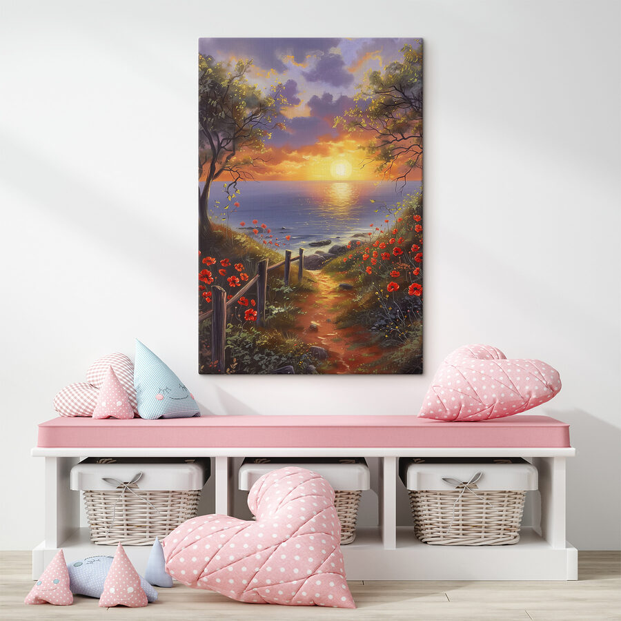 Stel je een scène voor waar een kronkelend pad je uitnodigt om op verkenning te gaan – een reis naar de waterkant, omlijst door levendige bloemen die wiegen in de wind. Deze canvasprint legt die essentie perfect vast. Het is alsof je een stukje natuur in huis haalt, een zachte herinnering aan zonnige wandelingen en het zachte geruis van de golven. De kleuren dansen in het licht en roepen de magie van het gouden uur op. Het is niet alleen decor; het is een stemmingsmaker, een dagdroom die op zich laat wachten. Perfect boven een bank of in een gezellig leeshoekje, het vertelt een verhaal van avontuur, rust en de schoonheid van onze wereld.