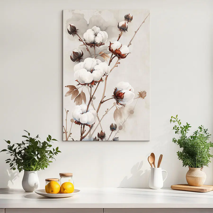 Bekijk de Canvas Schilderijen s39215-een zachte plons aquarelkunst die een frisse wind door je interieur laat waaien! Die zachte, pluizige witte bloemen, in contrast met de aardse bruintinten en subtiele groentinten, fluisteren bijna kalmte en warmte. Stel je voor dat dit in je woon- of slaapkamer hangt en een vleugje serene natuur toevoegt aan je dagelijkse leven. Het is net een wandeling door een vredige tuin, zonder er echt doorheen te lopen!