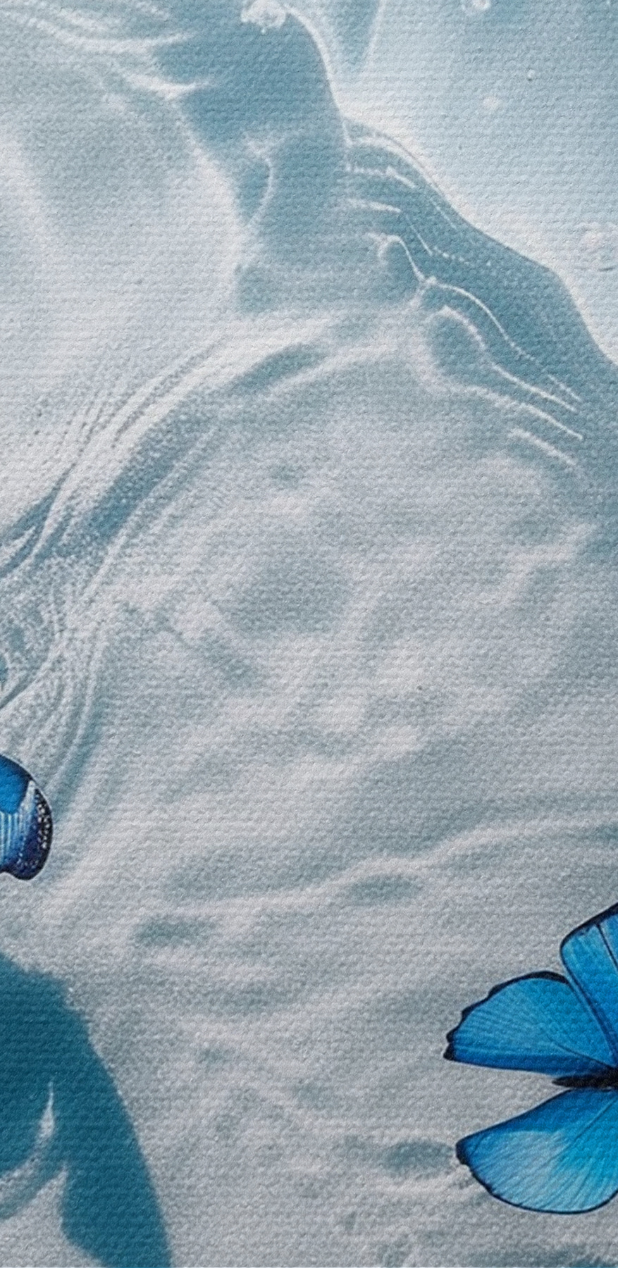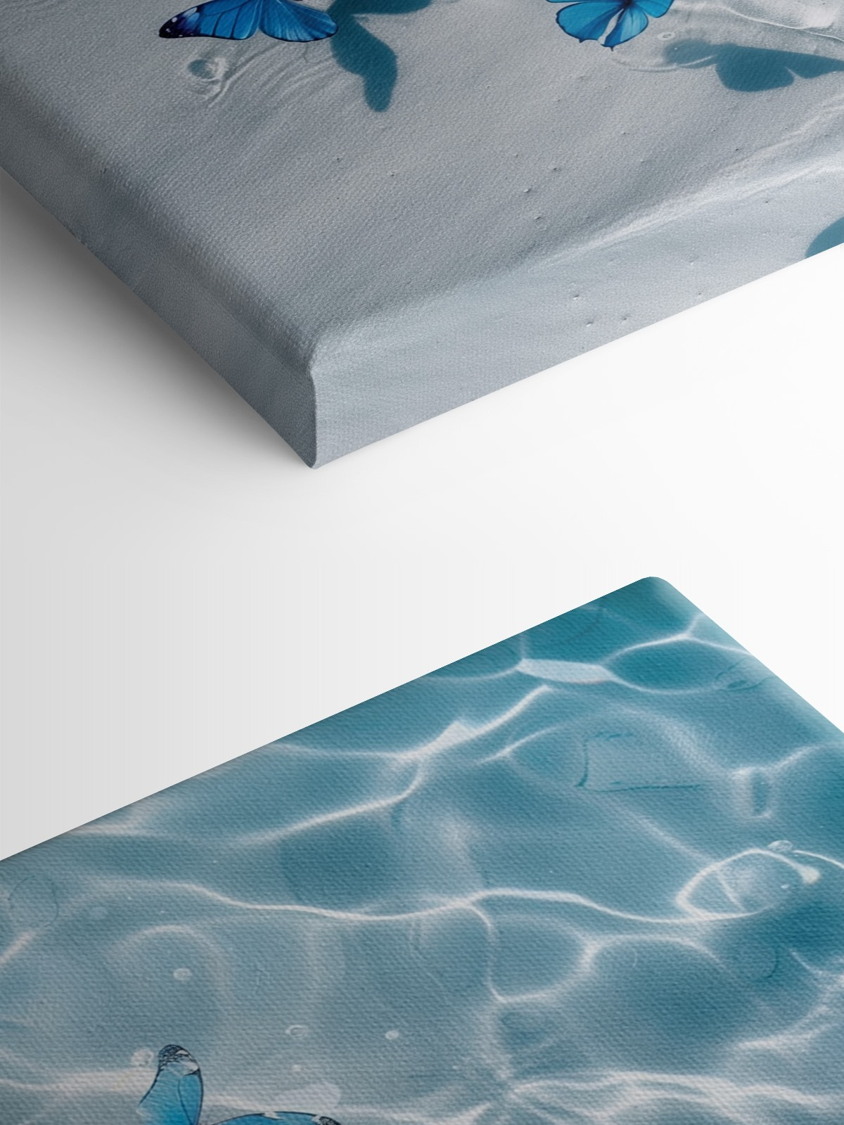 Transformeer elke ruimte met deze prachtige canvasprint met een groep levendige blauwe vlinders die dansen op zacht water. Het is als een mini-vakantie voor je muren, die een vredig strandgevoel en de magie van de natuur oproept. Stel je voor dat je een kamer binnenstapt en je voelt een serene golf over je heen spoelen, alsof je ontspant aan een rustige kust.