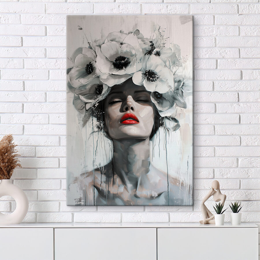 Verander elke muur in een conversatiestarter met deze prachtige canvasprint. Het toont een vrouw getooid met een betoverende kroon van bloemen, haar serene uitdrukking nodigt kijkers uit om na te denken over de schoonheid van de natuur en zelfexpressie. Stel je voor dat je een kamer binnenloopt en onmiddellijk wordt aangetrokken door haar innemende aanwezigheid – ze zou bijna kunnen aanzetten tot dagdromen over middagen doorgebracht in wilde bloemenvelden! Het delicate contrast van monochrome tinten met een vleugje levendige kleur voegt een moderne flair toe. Perfect voor gezellige hoekjes of chique woonkamers, dit stuk fluistert verfijning terwijl het een leuke, kunstzinnige vibe laat zien. Geniet van deze dosis inspiratie van je muren; ze zullen elke stemming opbeuren!
