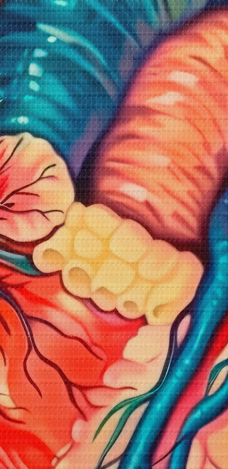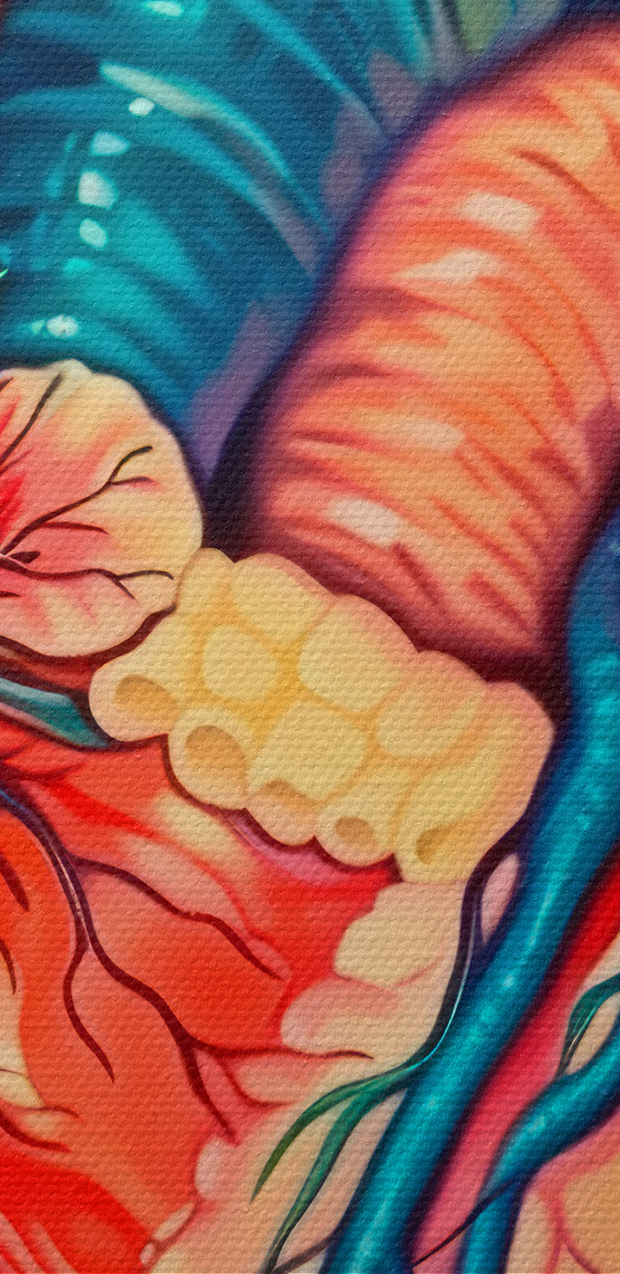 Stel je voor dat dit in je woonkamer of studio hangt. Reacties van gasten? “Wauw!” Allereerst valt de explosie van kleuren op: dieprood, kalmerend blauw en die felle gelen. Het is bijna alsof het hart leven in de bloemen pompt. Het heeft iets poëtisch, vind je niet?
