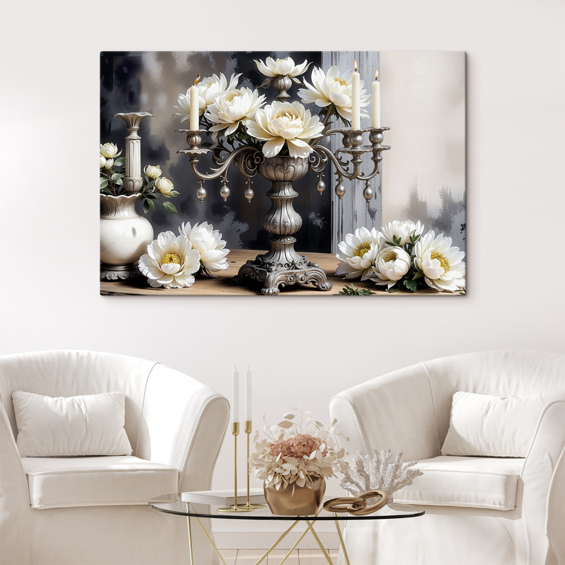 Stel je voor dat je een gezellige kamer binnenloopt en je meteen verwelkomd voelt door de charme van deze canvasprint. Het toont een prachtige kandelaar die zachte witte bloemen wiegt. Perfect om warmte toe te voegen, het is alsof je een vriend uitnodigt voor de thee, zelfs als je alleen bent. Het elegante tafereel roept verhalen op van diners bij kaarslicht en vrolijke bijeenkomsten. Het zou prachtig staan boven een schoorsteenmantel of zelfs in een eetkamer – het brengt een vleugje gratie zonder al te formeel te zijn. Elke blik erop kan een beetje vreugde opwekken en je eraan herinneren dat schoonheid overal is, zelfs op de meest gewone dagen.