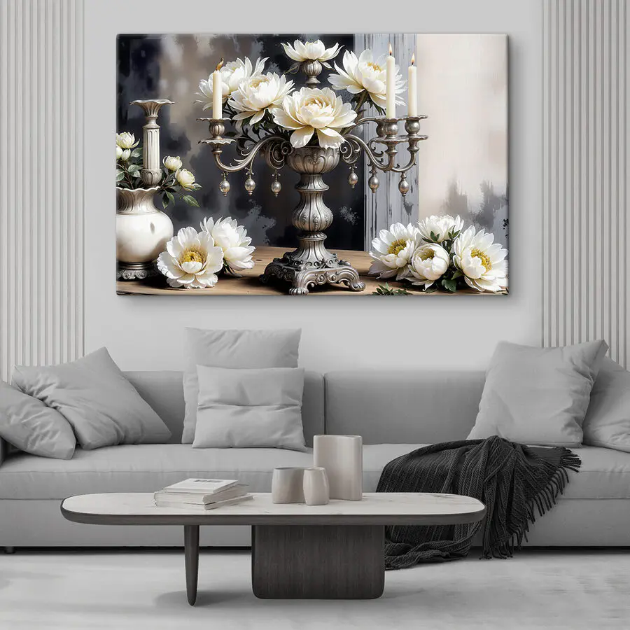 Stel je voor dat je een gezellige kamer binnenloopt en je meteen verwelkomd voelt door de charme van deze canvasprint. Het toont een prachtige kandelaar die zachte witte bloemen wiegt. Perfect om warmte toe te voegen, het is alsof je een vriend uitnodigt voor de thee, zelfs als je alleen bent. Het elegante tafereel roept verhalen op van diners bij kaarslicht en vrolijke bijeenkomsten. Het zou prachtig staan boven een schoorsteenmantel of zelfs in een eetkamer – het brengt een vleugje gratie zonder al te formeel te zijn. Elke blik erop kan een beetje vreugde opwekken en je eraan herinneren dat schoonheid overal is, zelfs op de meest gewone dagen.