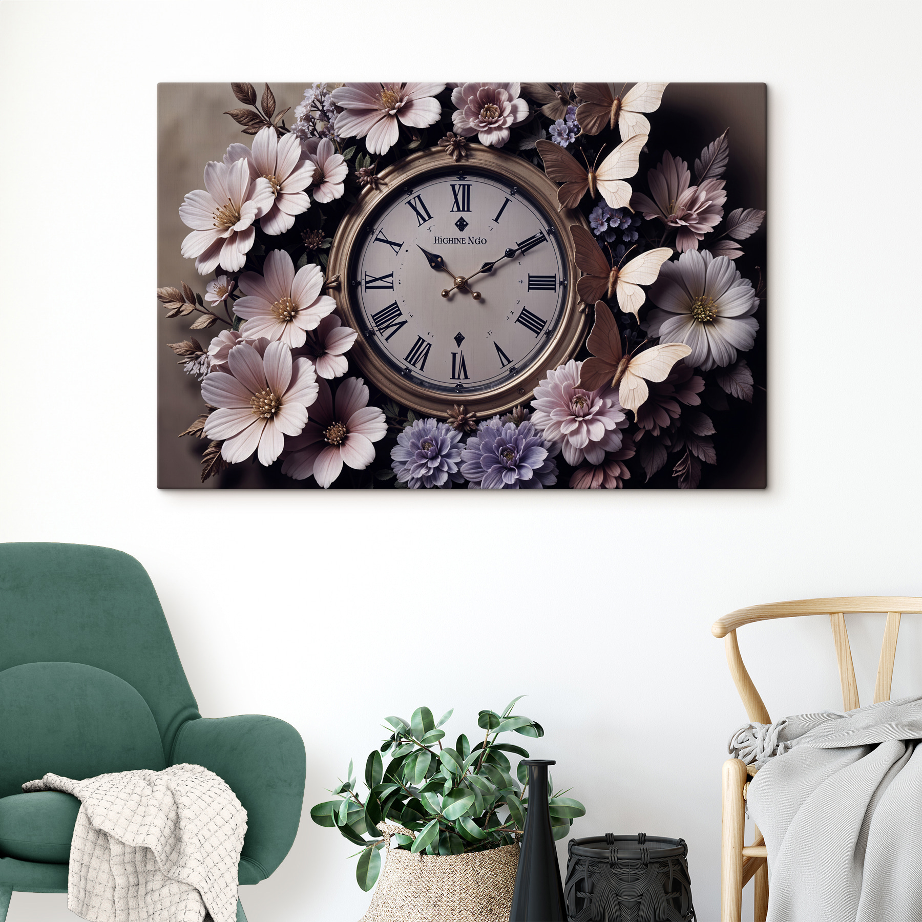Deze Canvas Print, “Klok omringd door bloemen”, is als een kleine dagdroom aan je muur. Stel je voor: een charmante klok tussen delicate bloemen en fladderende vlinders. Het gaat niet alleen om het bijhouden van de tijd – het gaat ook om het creëren van een sfeer, waardoor die effen muur verandert in een oase van kleur en warmte. Stel je voor dat je thee drinkt in een gezellig hoekje, een blik werpt en glimlacht om die zachte bloemblaadjes. De mix van natuur en elegantie voegt een vleugje eigenzinnigheid toe. Een perfecte gespreksstarter, of gewoon een lieve herinnering om de kleine momenten in het leven te waarderen, zoals wanneer die bloemen in de tuin bloeien. Ideaal om elke ruimte op te fleuren met een vleugje persoonlijkheid!