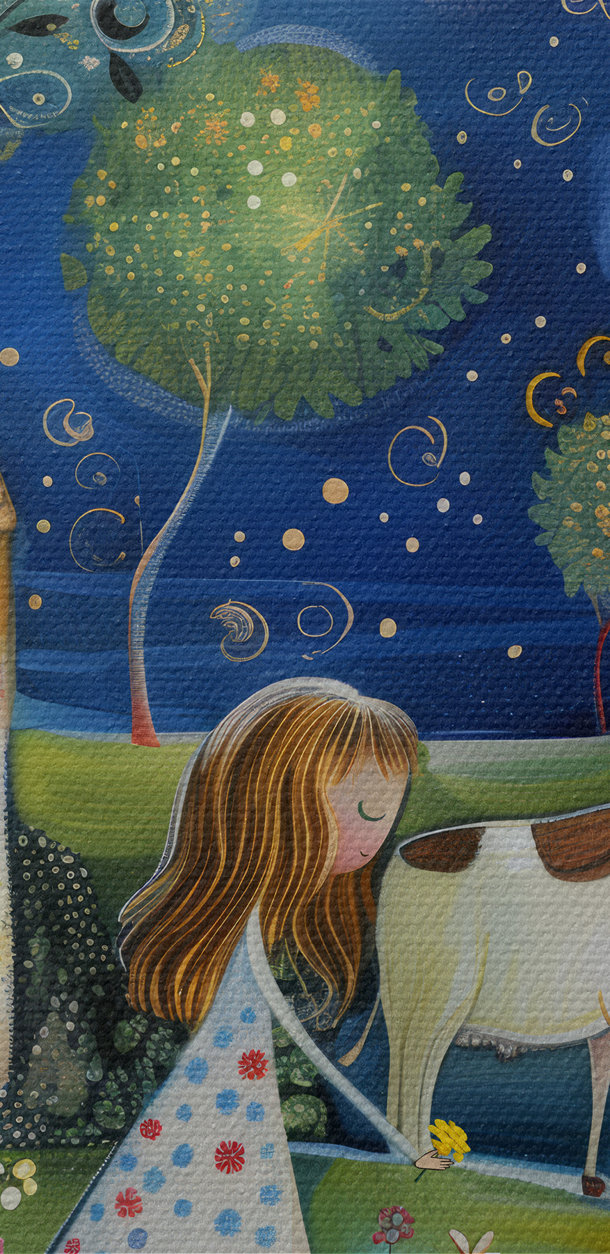 Stel je voor dat je een klein stukje magie van de natuur in je woonkamer hebt. Dat is precies wat de “Canvas Schilderijen s39451” biedt – pure grillige charme bij elke blik. Genesteld onder een sterrenhemel en bewaakt door een dromerige maansikkel, brengen een knus huisje en een lief meisje dat een koe leidt je onmiddellijk tot rust. De bloemen langs het pad lijken te dansen onder het maanlicht en voegen een vleugje vrolijkheid toe aan elke ruimte.