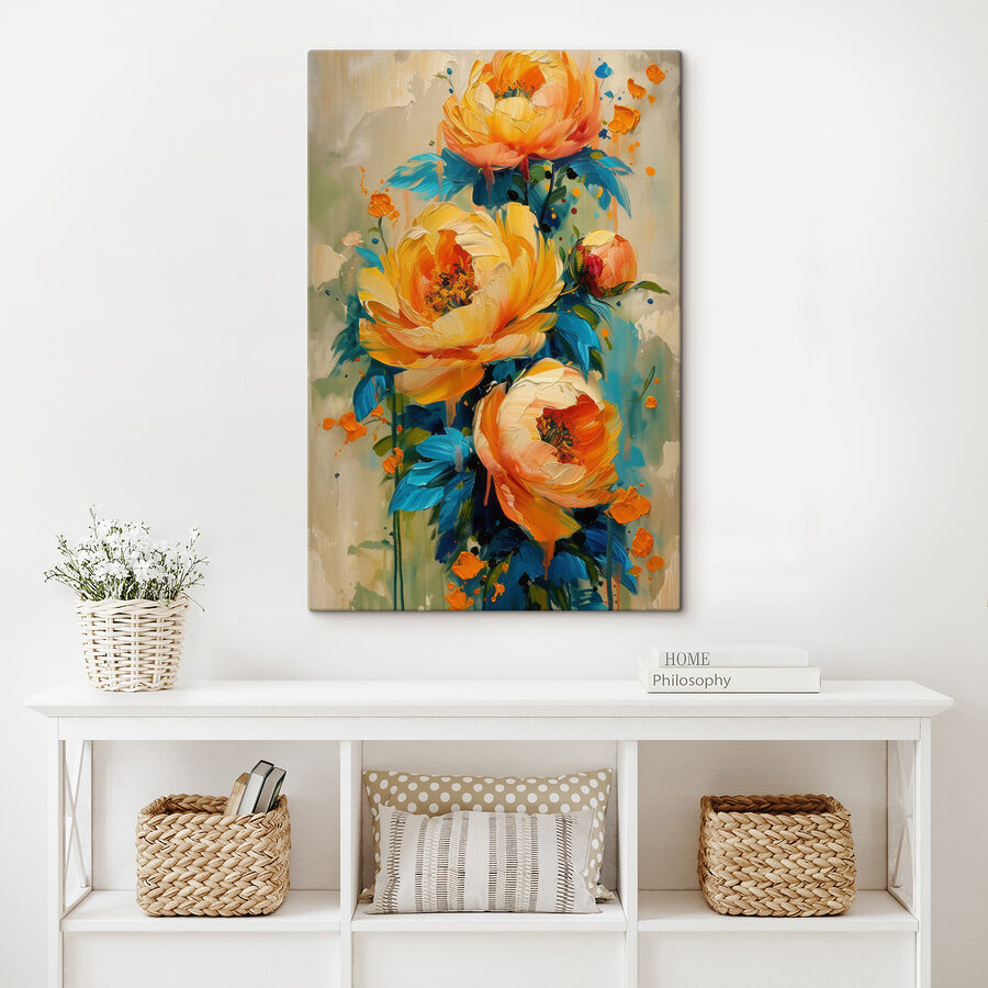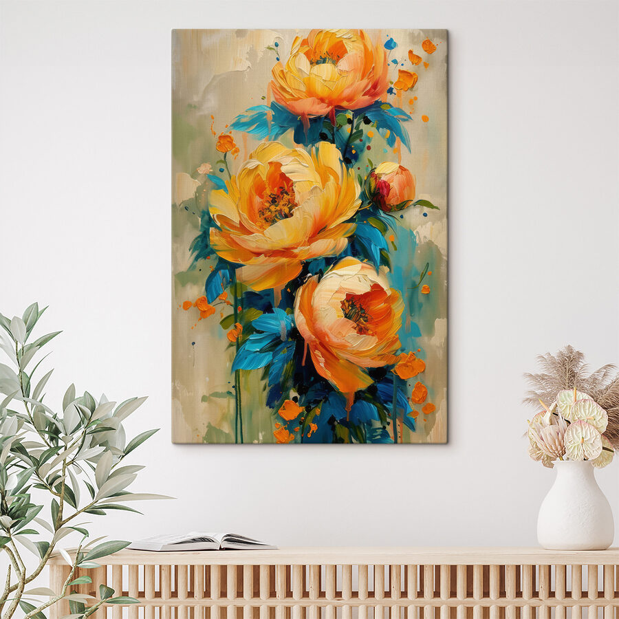 Fleur je kamer op met deze levendige canvasprint met prachtige bloemen die eruit zien alsof ze net in leven zijn uitgebarsten. De kleurenpracht – zacht geel, vrolijk oranje en verfrissend groen – trekt de aandacht en zorgt ervoor dat elke kamer warm en uitnodigend aanvoelt. Stel je voor dat je ‘s ochtends aan je koffie nipt, naar dit kunstwerk staart en je je plotseling in een zonnige tuin waant in plaats van in een keuken. Het is net een stukje natuur aan je muur! Perfect voor slaapkamers, woonkamers of andere plekken die wel wat vrolijkheid kunnen gebruiken. Laat het je liefde voor unieke decoratie spreken!