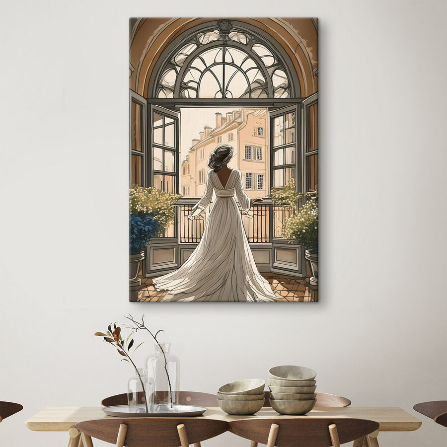 Ooit gedroomd van een tijdloos moment van schoonheid en elegantie? Deze canvasprint, genaamd “Canvas Schilderijen s39480”, legt precies dat vast. Stel je dit voor – een vrouw, elegant gedrapeerd in een vloeiende jurk, kijkt naar buiten vanuit een groot boograam. Het stadslandschap buiten met zijn charmante gebouwen fluistert verhalen van romantiek en nostalgie. De zachte tinten en ingewikkelde details geven je het gevoel dat je bij haar bent, misschien wel op een luie zondagochtend, terwijl je die serene sfeer opsnuift.