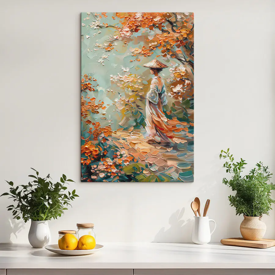 Stap in een serene dagdroom met deze canvasprint, “Schilderij van een vrouw wandelend in een park”. Stel je voor dat je wordt meegevoerd naar een rustige ochtend, waar de lucht knispert en de bladeren knisperen onder je voeten. De kleuren zijn als een warme knuffel-rijke sinaasappels vermengd met koel blauw. Het is alsof deze vrouw precies wist waar ze rust kon vinden. Perfect voor een knus hoekje of de kamer waar je tot rust komt, het fluistert rust en nieuwsgierigheid tegelijk. Hang het op en wie weet? Misschien voel je je dan een beetje meer zen en minder als een wervelwind. Kunst die ademt, letterlijk. Het is behoorlijk populair, weet je.