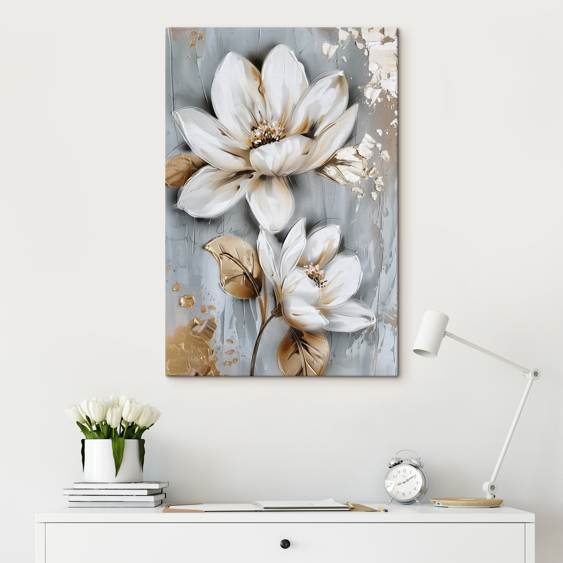 Fleur elke ruimte op met deze prachtige canvasprint met prachtige bloemen op een zacht grijs oppervlak. Het is alsof je een stukje natuur in huis haalt, zonder de gieter. Stel je voor dat je een kamer binnenloopt en die zachte uitbarsting van bloemenfrisheid voelt – geen allergieën hier! De zachte tinten en het elegante ontwerp creëren een warme en uitnodigende sfeer. Perfect voor een gezellig leeshoekje of die lege muur die smeekt om wat liefde. Serieus, het is het soort kunst dat je doet glimlachen elke keer als je er langs loopt. Wie wist dat bloemdecoratie ook een dagelijkse oppepper kon zijn?