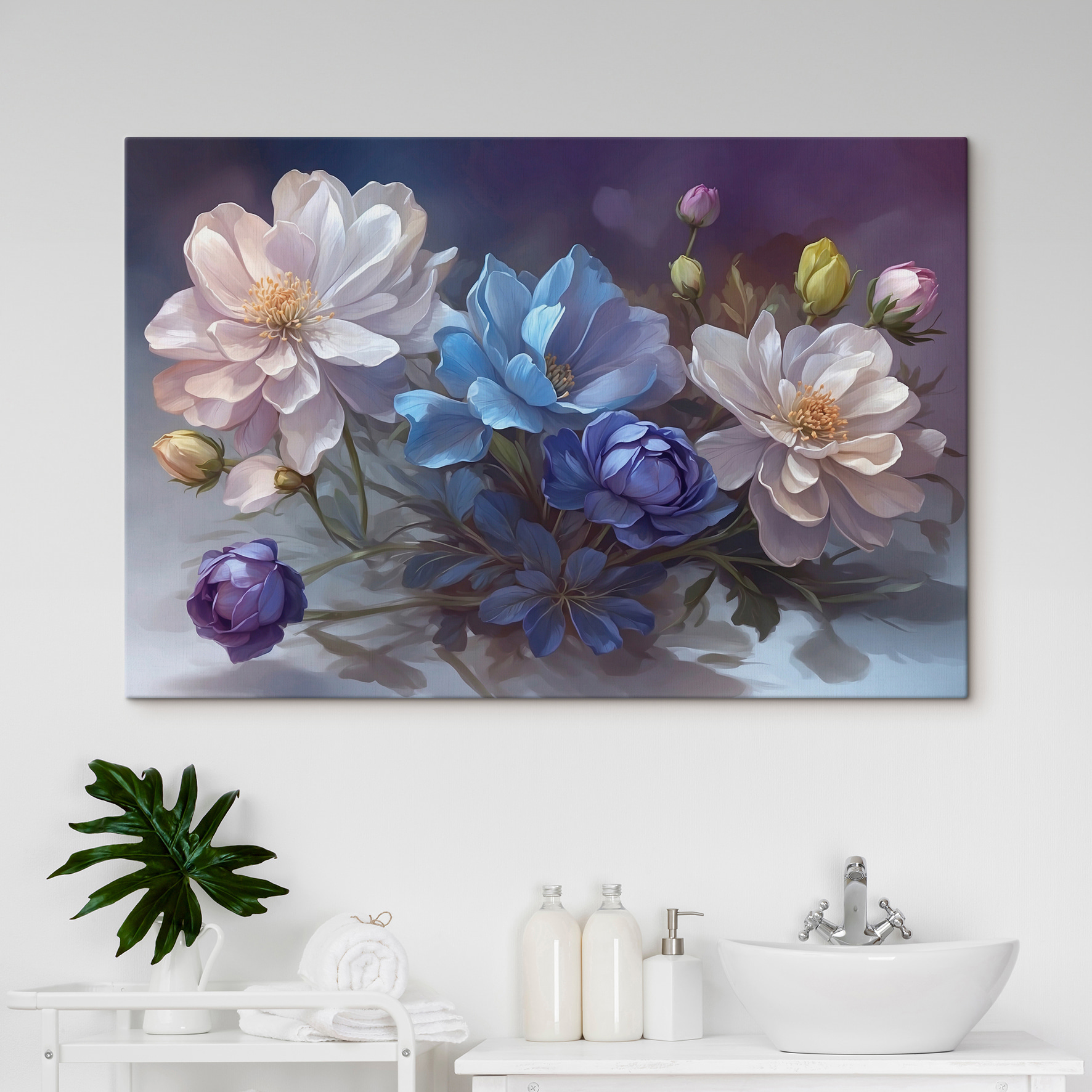 Deze canvasafdruk – met de liefkozende naam “Canvas Schilderijen s39603” – is als een zacht gefluister van de lente in je woonkamer! Met een dromerige mix van wit, blauw en zacht paars is het perfect voor iedereen die van de serene schoonheid van bloemen houdt. Stel je dit eens voor: Je zit lekker opgekruld met een kopje thee, een goed boek en dit prachtige stuk aan je muur. De levendige maar rustgevende bloemen creëren een gezellige, uitnodigende sfeer waardoor je thuis wilt blijven en gewoon… wilt zijn.