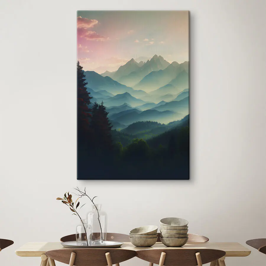 De kleuren zijn dromerig – zachte pasteltinten die overgaan in diepe, rijke groentinten… Het is alsof de bergen je hun geheimen toefluisteren. Perfect voor iedereen die behoefte heeft aan een vleugje rust in huis. En die glooiende heuvels? Ze smeken je bijna om te verdwalen in hun diepten.