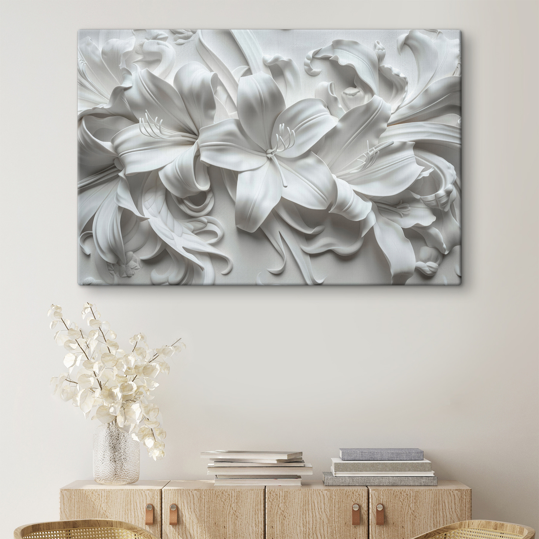 Transformeer elke ruimte met deze prachtige canvasprint met een delicate witte bloem op een wit oppervlak. Het is een mooie mix van eenvoud en elegantie die iedereen even stil doet staan en wat dieper laat ademen. Stel je voor dat dit stuk in een gezellig hoekje hangt, misschien zelfs naast een dampende kop koffie. De manier waarop het licht speelt met de subtiele nuances kan de sfeer in een kamer direct oppeppen. Dit kunstwerk is perfect voor mensen die van ingetogen schoonheid houden en fluistert verfijning terwijl het uitnodigt tot warme, kalmerende sferen. Het is als een zachte knuffel voor je muren.