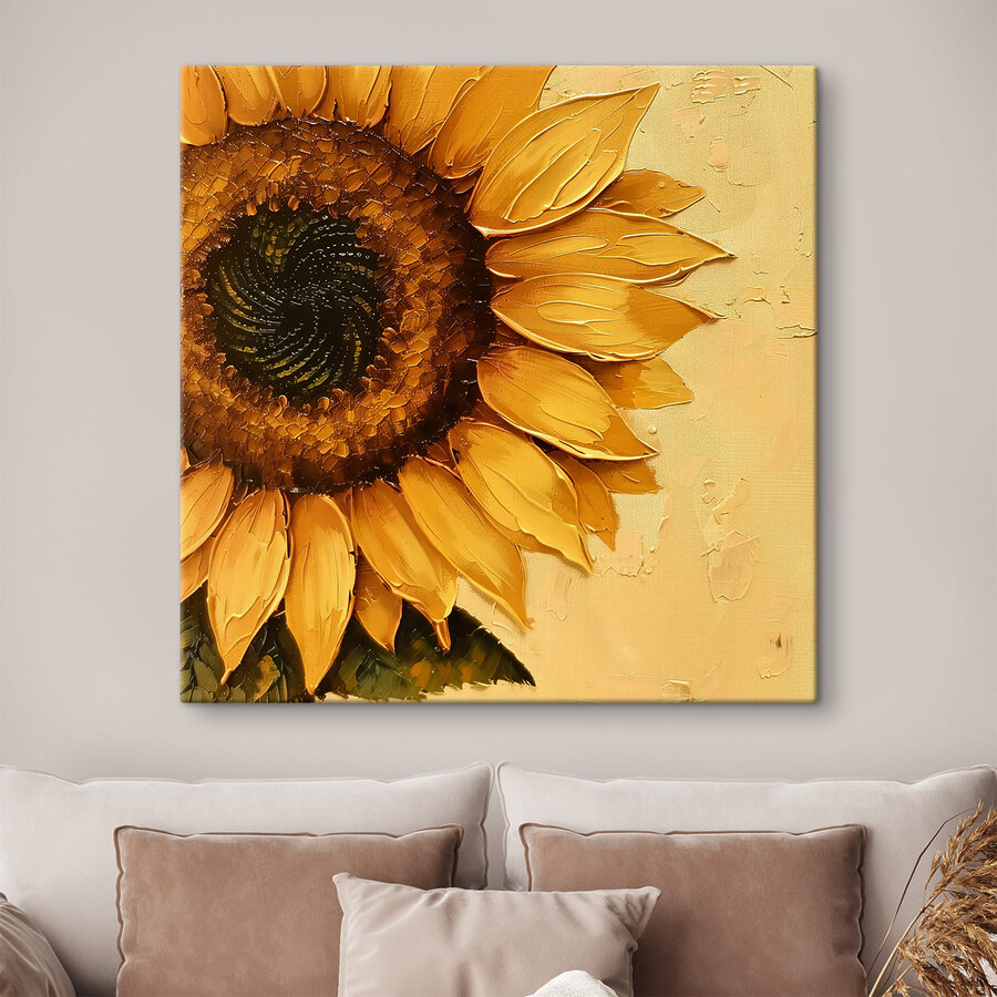 Fleur elke kamer op met deze prachtige canvasprint van een zonnebloem. Het is alsof je een zonnige dag binnenshuis haalt, en wie kan er niet een beetje zonneschijn gebruiken? De rijke gelen en aardgroene tinten steken af tegen een warme achtergrond, waardoor het een perfecte gespreksstarter is. Stel je voor dat het in een gezellige leeshoek of boven de eettafel hangt en zelfs op de somberste dagen een glimlach op je gezicht tovert. Of het nu een cadeau is voor een vriend of een kleine traktatie voor jezelf, dit stuk voegt een vleugje natuurlijke schoonheid toe en herinnert iedereen eraan te bloeien waar ze geplant zijn. Bovendien verwelkt hij niet!