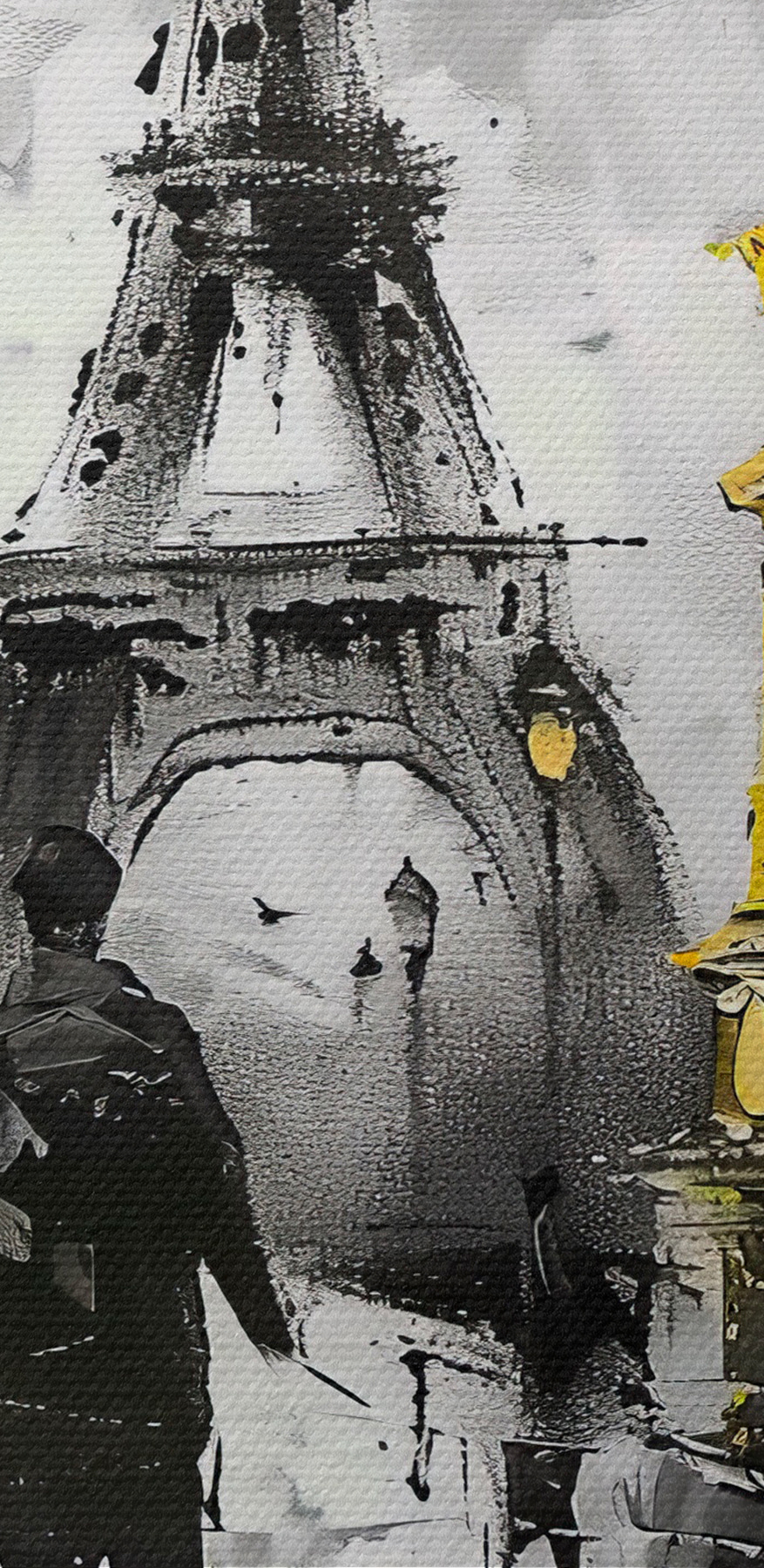 Stel je voor dat je in een wereld stapt waar de zwart-wit elegantie van een klassieke film samenkomt met de levendige hartslag van een bruisende stad. Deze canvasprint, “s39692”, legt die magie vast. Alsof je regelrecht Parijs bent binnengewandeld – zonder de jetlag – verdwaal je in de romantiek van het stadslandschap. De geliefden in de scène voelen als oude vrienden, rustig wandelend onder de bekende schaduw van de Eiffeltoren. Er is een vleugje kleur – net genoeg om de monochrome betovering te verbreken en alles levendig te maken. Perfect voor aan de muur in de woonkamer of boven dat knusse leeshoekje – waar je de helft van de tijd vergeet te gaan zitten. Dit stuk is niet zomaar een foto; het is een conversatiestarter – een stukje Parijse dagdroom.