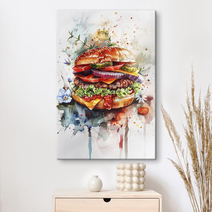 Hier is een kunstwerk dat je keukenmuren hongerig zal maken! Maak kennis met “Canvas Schilderijen s39699” – een lust voor het oog en een leuke gespreksstof voor je foodie vrienden. Stel je voor dat dit levendige meesterwerk van een cheeseburger boven je eettafel hangt en een vleugje kleur en eigenzinnigheid toevoegt aan elke maaltijd. De aquareltechniek geeft het een dromerige, bijna sappige kwaliteit – je kunt bijna de versheid van de sla proeven, de pittigheid van de augurken, en oooh die smeltende kaas…