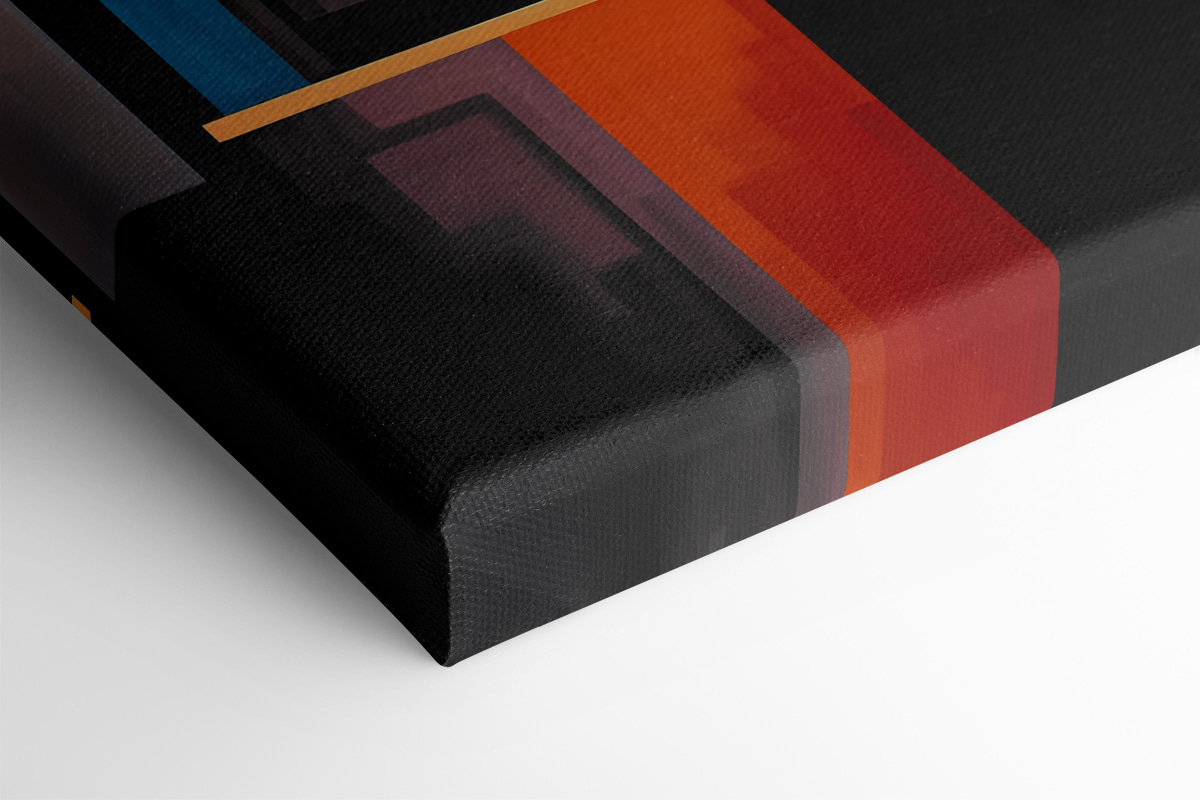 Het heeft van die warme rode en oranje tinten gemengd met koel blauw – het voelt een beetje als de zon die ondergaat boven een futuristische stad. Elke keer dat je er naar kijkt, zie je een nieuw detail, een verborgen vorm of een ander gevoel van diepte. Het is niet zomaar een kunstwerk, het is een ervaring.