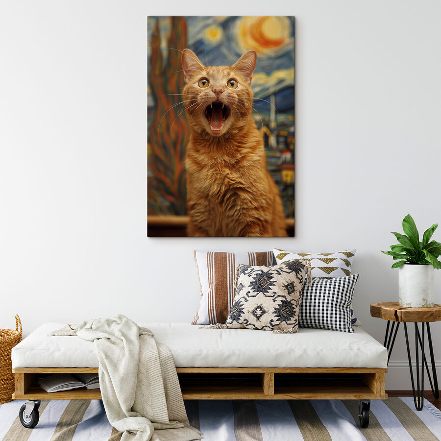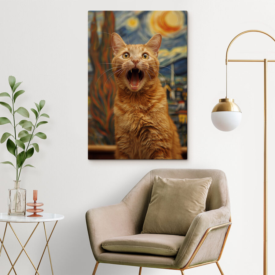 Het is alsof de kat denkt, “Wat gebeurt hier in vredesnaam?”. En eerlijk gezegd, is dat niet een vraag die we allemaal wel eens hebben? Stel je voor dat deze print een heleboel gesprekken losmaakt of gewoon een glimlach op je gezicht tovert na een lange dag. De kleuren zijn levendig en de combinatie van de hedendaagse kat met een vleugje kunst zorgt voor een charmant en onvergetelijk kunstwerk. Plaats het op een plek die wel wat eigenzinnigheid kan gebruiken – je gasten, zowel mensen als katachtigen, zullen verrukt zijn!