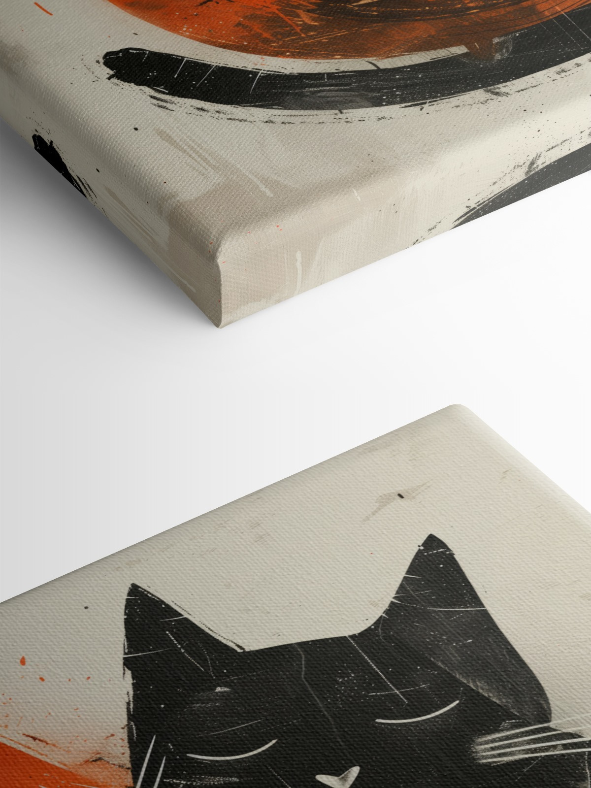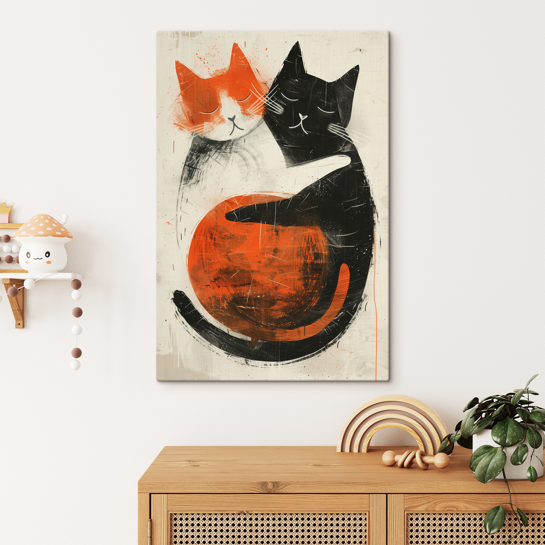 Dit kunstwerk hoort overal thuis, van woonkamers tot bedhoeken. Het heeft een coole, bijna retro flair, een mix van levendige sinaasappels en diep zwart om een warm, uitnodigend gevoel te creëren. Stel je voor dat je na een lange dag thuiskomt – als je deze schattige gezichtjes ziet, smelt alle stress weg. Het is net een miniknuffel op canvas! Makkelijk om van te houden en nog makkelijker te integreren in je bestaande inrichting, het spreekt zowel kunstliefhebbers als kattenliefhebbers aan. Dus geef je muren iets om over te lachen!