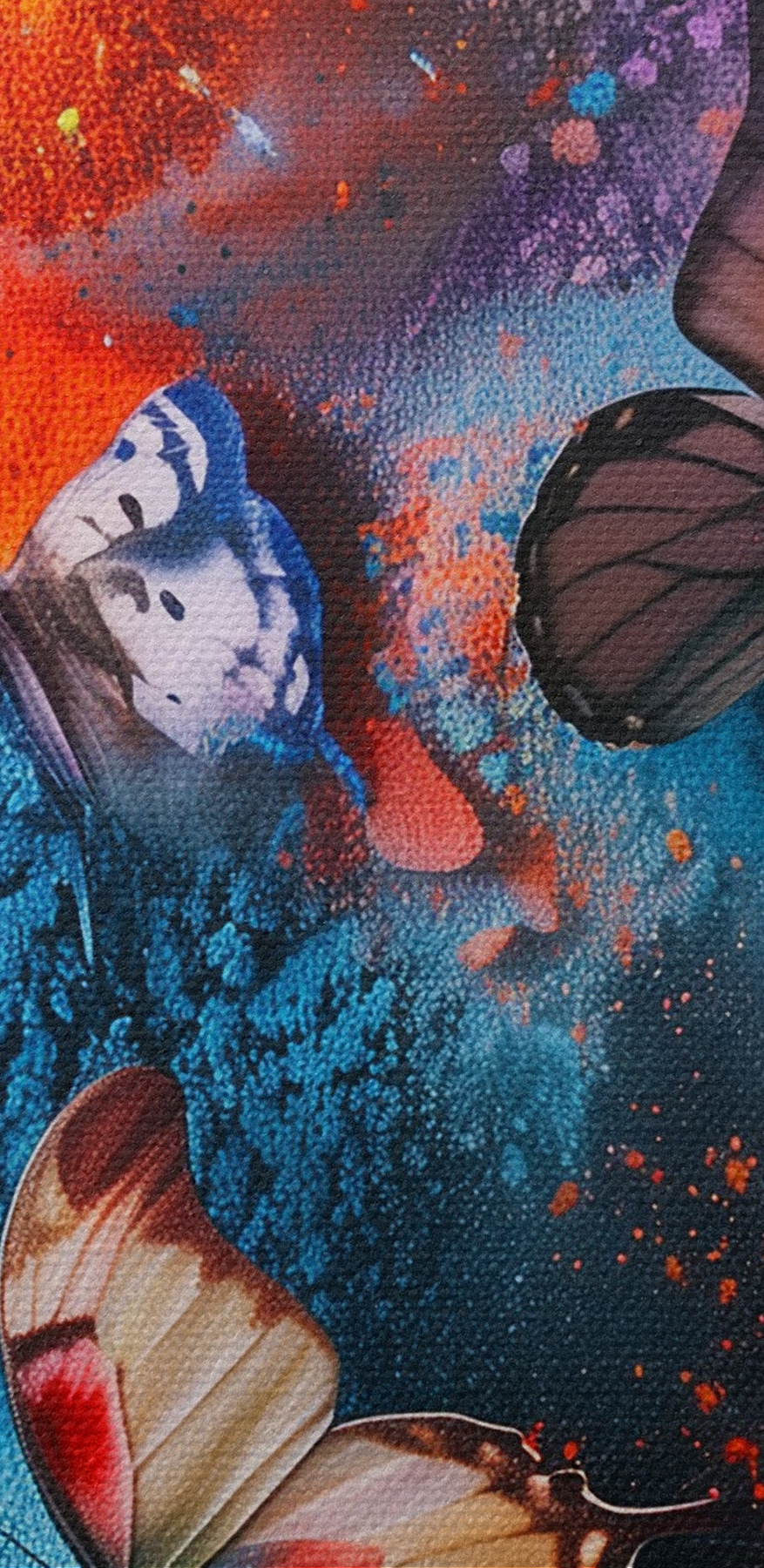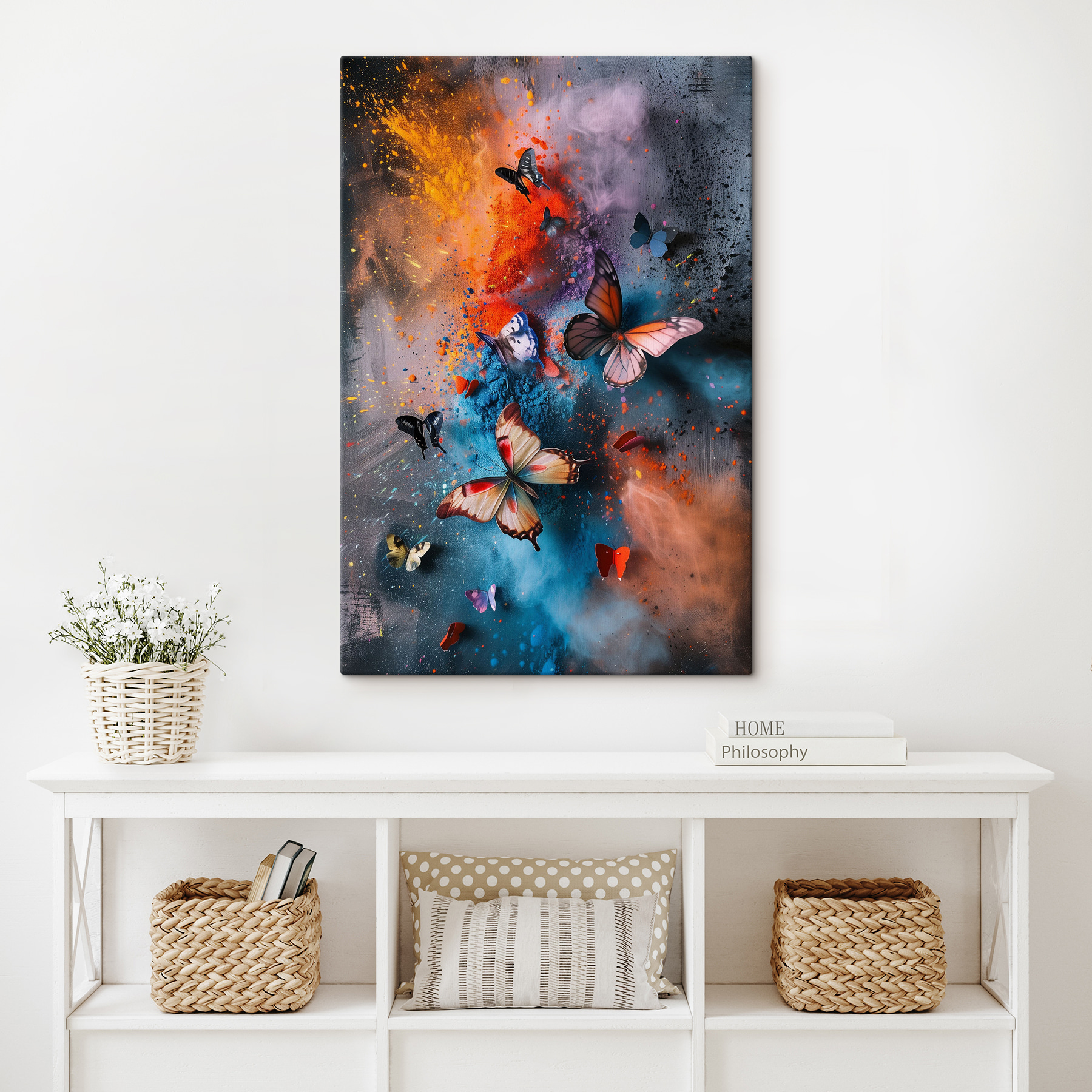 Dit canvas blijft niet gewoon aan de muur hangen, het danst! De vlinders lijken bijna klaar om je kamer in te fladderen. Je zou jezelf wel eens kunnen betrappen op dagdromen, helemaal opgaand in de mix van rijke kleuren en abstracte patronen. Perfect voor iedereen die graag een vleugje buitengewoon toevoegt aan zijn of haar alledaagse ruimte.