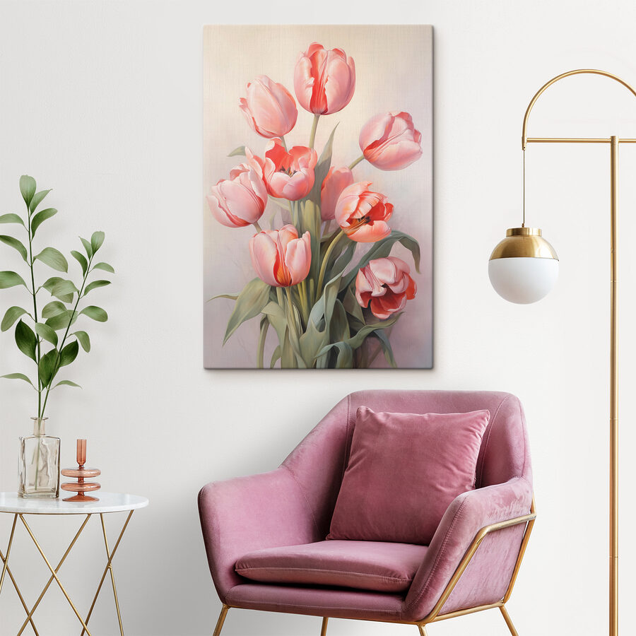 Is deze tulp op canvas niet dromerig? Stel je voor dat hij in je kamer hangt – helder, vrolijk en o zo uitnodigend! Deze zachtroze en koraalkleurige tulpen barsten van het leven en wiegen lui in een zacht briesje. Alsof je het hele jaar door je eigen hoekje van een lentetuin aan je muur hebt hangen.