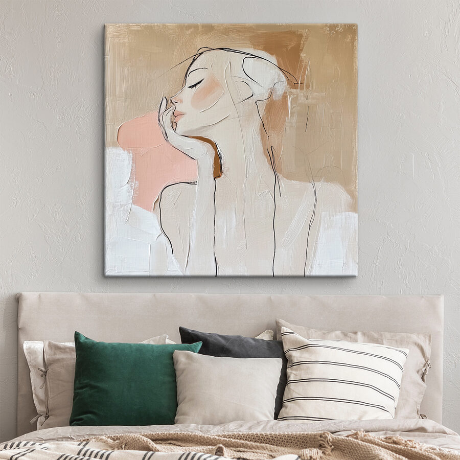 Stap in een wereld waar eenvoud en elegantie elkaar ontmoeten met deze prachtige canvasprint. Op het kunstwerk rust een vrouw zachtjes met haar hand op haar gezicht, een rustig moment van reflectie uitademend. Het is alsof je een dagdroom vastlegt, bevroren in de tijd. Het zachte kleurenpalet past bij verschillende inrichtingsstijlen, waardoor het perfect past in knusse hoekjes of levendige woonkamers. Stel je voor dat het boven een leesstoel hangt – perfect om koffie te drinken op een regenachtige middag of gewoon om de tijd uit het oog te verliezen. Dit sieraad decoreert niet alleen; het nodigt je uit om even stil te staan, adem te halen en simpelweg te genieten van de schoonheid van het leven.