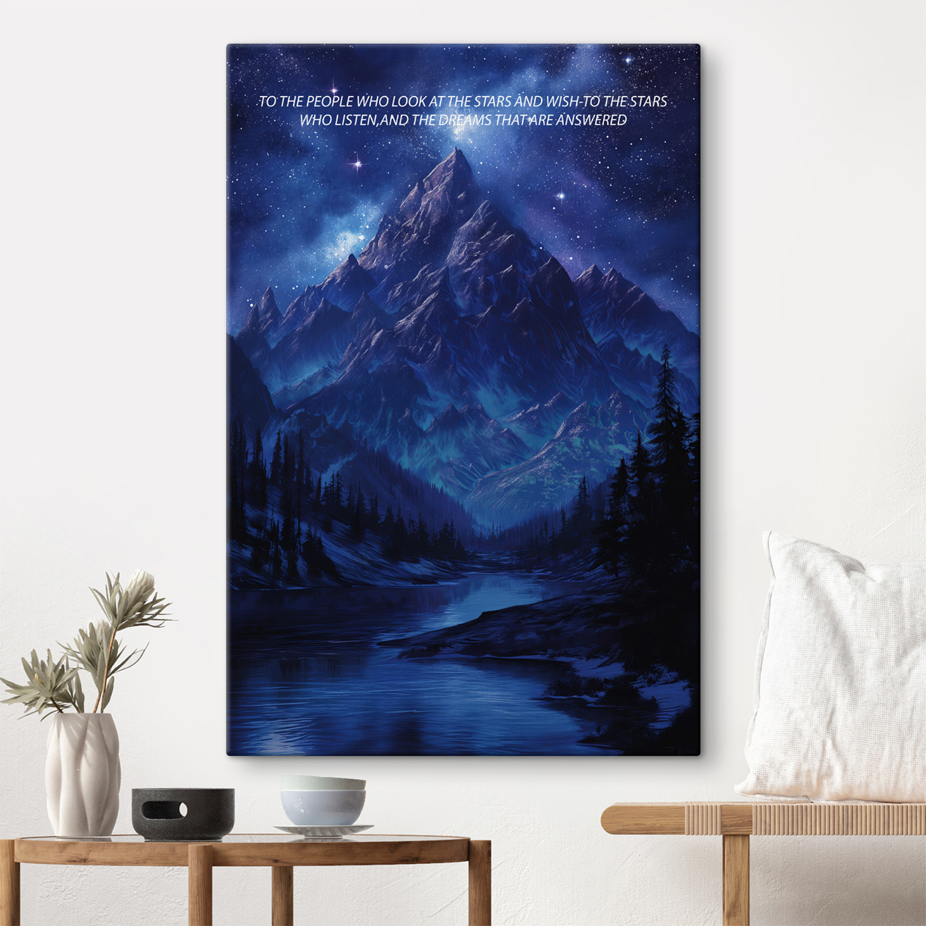 Stelt u zich eens voor dat u een rustige scène binnenstapt waar torenhoge bergketens een serene rivier ontmoeten en u uitnodigen om dieper adem te halen. Deze canvasprint legt de rust van de natuur vast, met bomen die als trouwe schildwachten overeind staan. Zie het voor je in je woonkamer, waar je gesprekken en dagdromen op gang brengt. Oh, hoe het een saaie muur verandert in een frisse wind! Of je nu op een regenachtige dag naar die diepe blauwe kleur staart of op een zonnige middag van avonturen droomt, dit kunstwerk decoreert niet alleen, het ontvouwt ook verhalen. Is het niet prachtig hoe kunst ons in zijn wereld kan trekken?