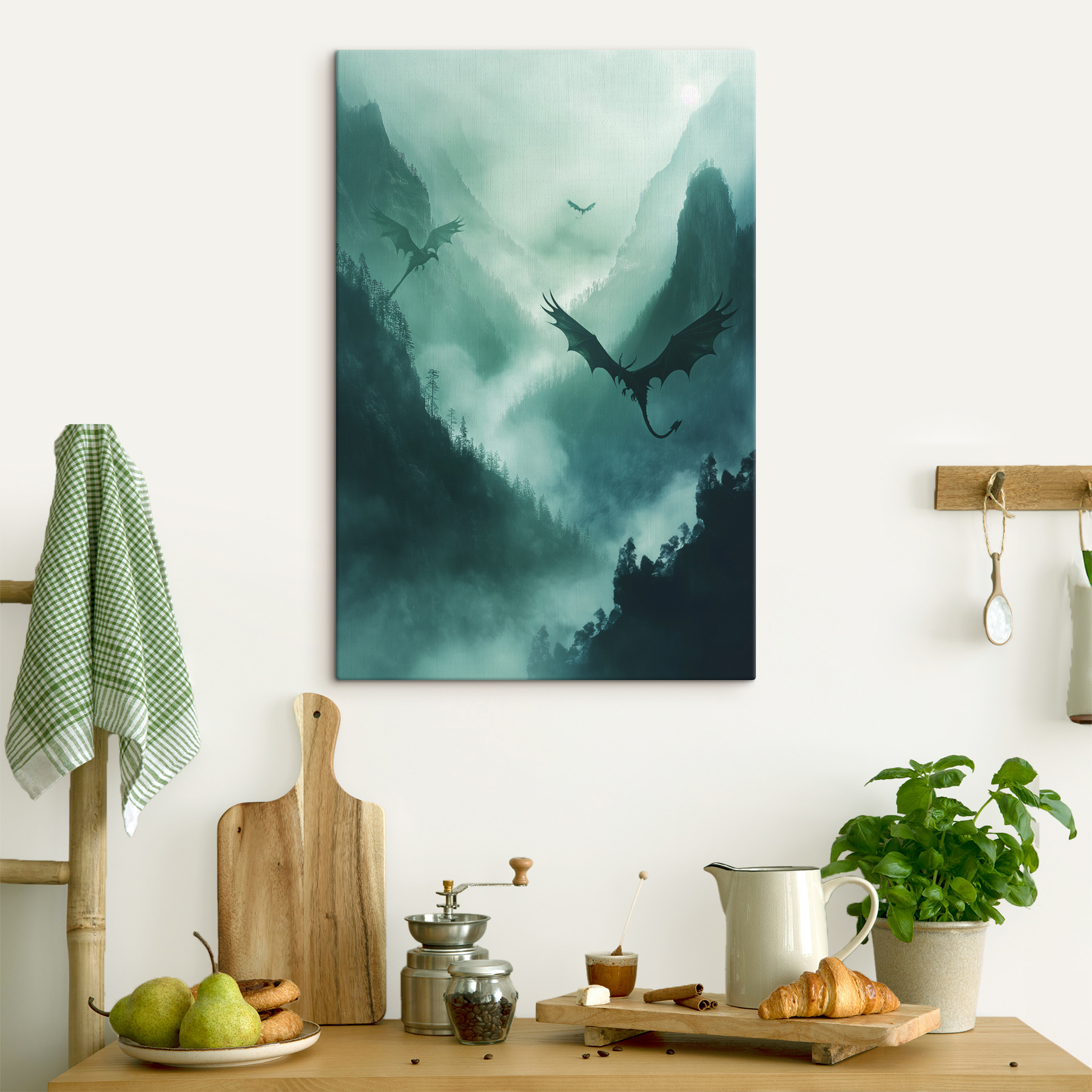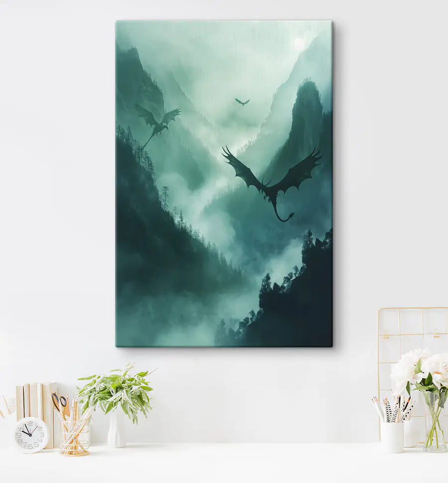 Transformeer je ruimte met dit fascinerende canvas van draken die door een mistige hemel zweven. Het is alsof je een beetje magie in huis haalt. Stel je voor dat je lekker wegkruipt met een goed boek terwijl deze mythische wezens boven je dansen in een wereld waar alles mogelijk is. De diepe groentinten en zachte grijstinten van dit kunstwerk creëren een rustgevende sfeer, perfect om in weg te dromen of gewoon om tot rust te komen na een lange dag. Het is niet zomaar kunst; het is een ontsnapping. Elke keer als je er naar kijkt, voel je misschien een tinteling van avontuur die je verbeelding prikkelt. Perfect voor elke kamer die een vleugje verwondering nodig heeft!
