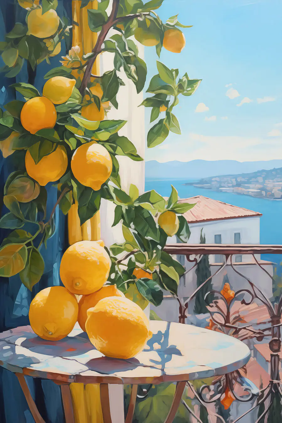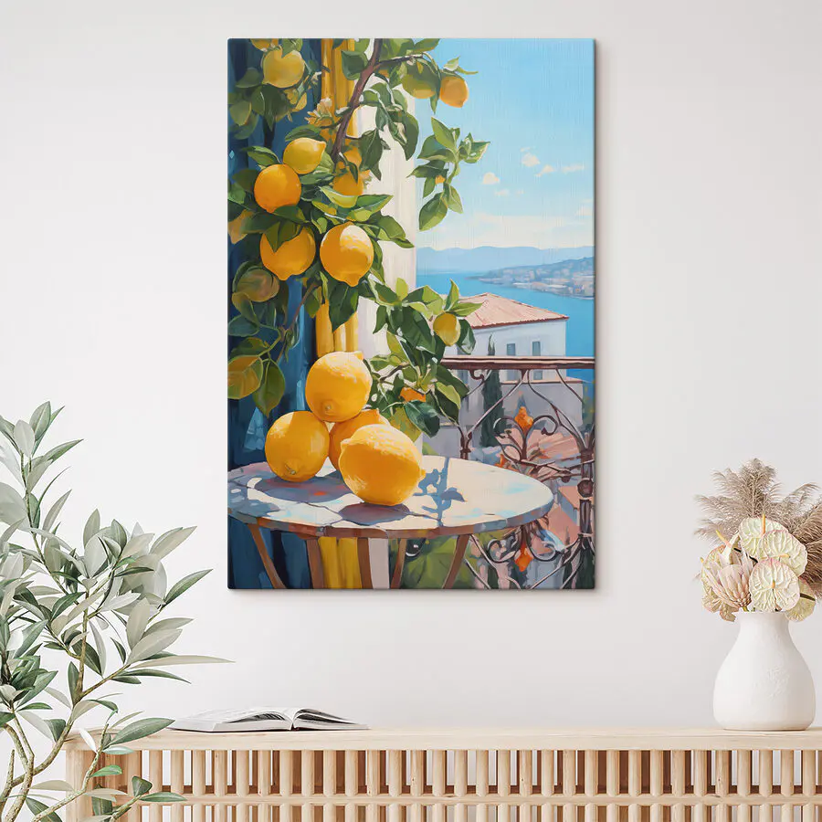 Bekijk deze levendige canvasprint, “Canvas Schilderijen s40091” – een prachtige toevoeging aan elke muur die aanvoelt als een frisse wind! Stel je voor: citroenen die zo helder zijn dat je ze bijna kunt proeven, gebalanceerd tegen de rustige blauwe achtergrond van een toevluchtsoord aan zee. Het is alsof je een stukje Middellandse Zee bij je thuis hebt.
