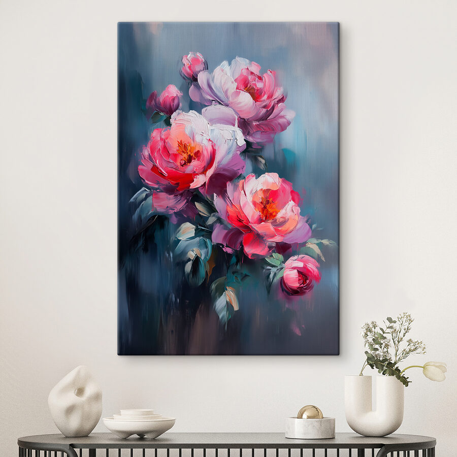 Stel je voor dat je je woonkamer binnenloopt en onmiddellijk begroet wordt door deze verbluffende explosie van kleur en elegantie – “Canvas Schilderijen s40127.” Het voelt alsof je een droomtuin binnenstapt waar de rozen altijd in bloei staan. De levendige roze en paarse tinten steken prachtig af tegen de diepe, mysterieuze achtergrond. Je kunt hun zoete geur bijna ruiken en het zachte geritsel van de bloemblaadjes horen.