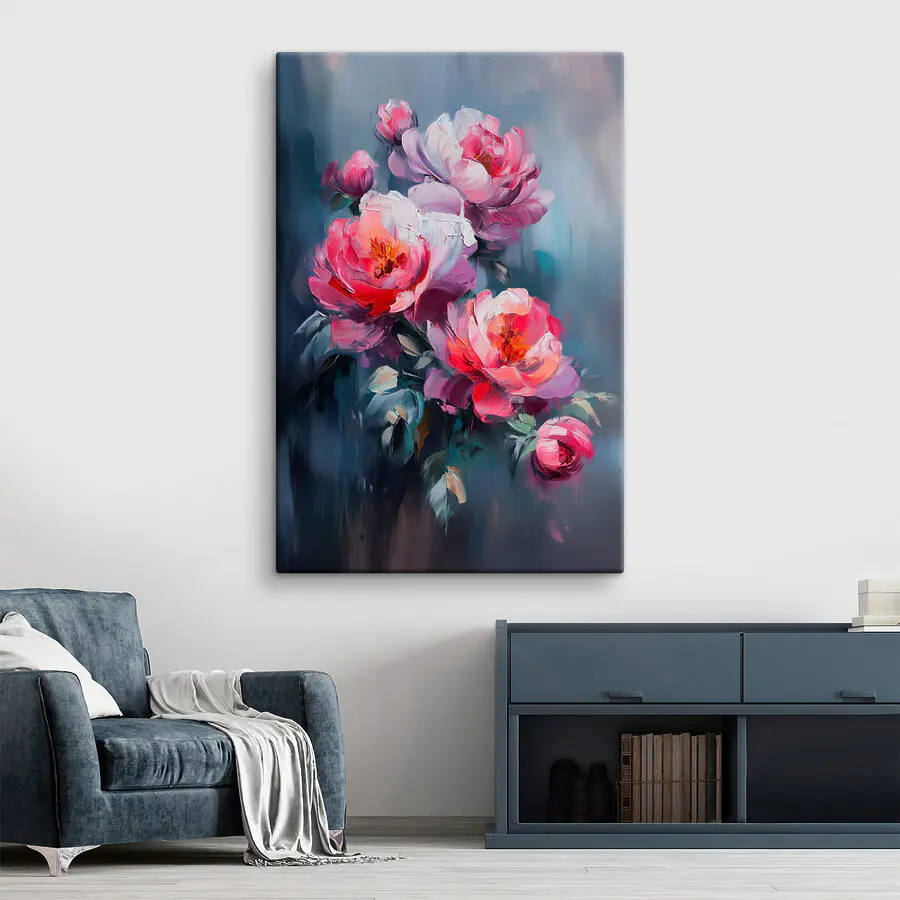 Stel je voor dat je je woonkamer binnenloopt en onmiddellijk begroet wordt door deze verbluffende explosie van kleur en elegantie – “Canvas Schilderijen s40127.” Het voelt alsof je een droomtuin binnenstapt waar de rozen altijd in bloei staan. De levendige roze en paarse tinten steken prachtig af tegen de diepe, mysterieuze achtergrond. Je kunt hun zoete geur bijna ruiken en het zachte geritsel van de bloemblaadjes horen.